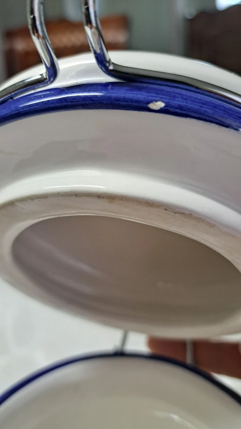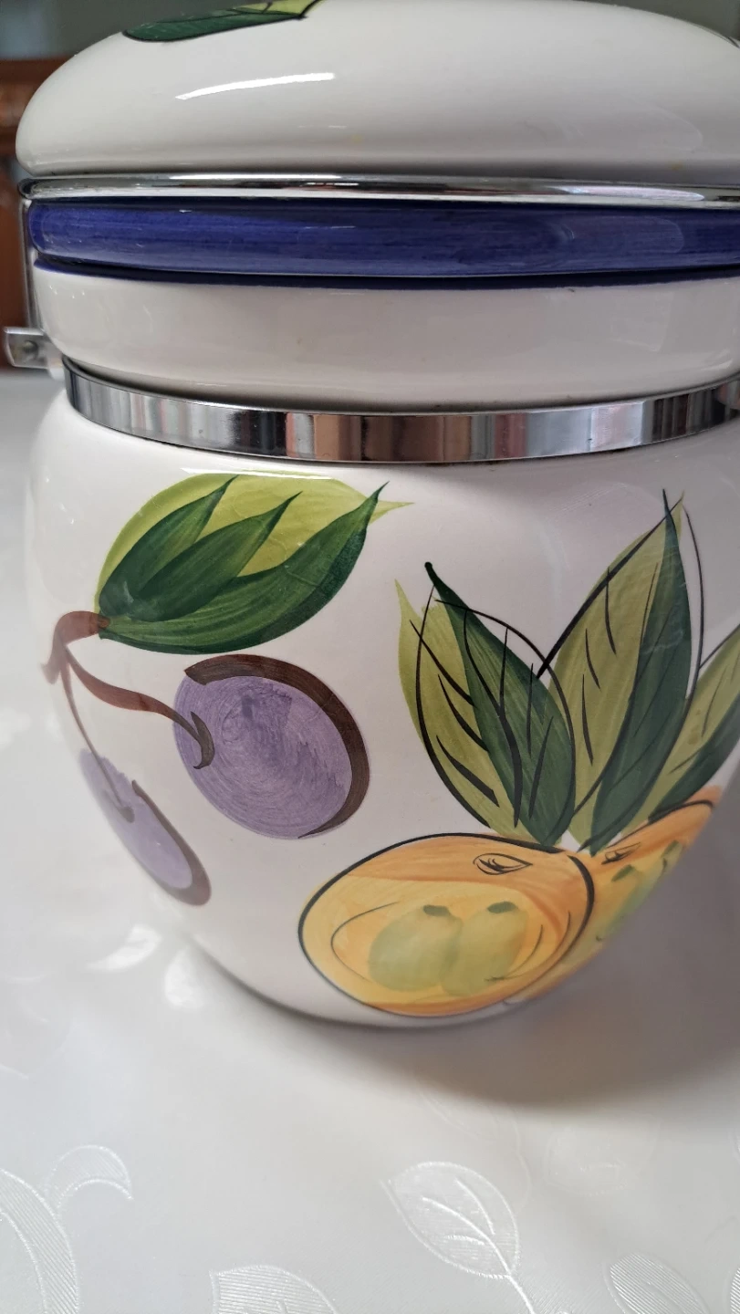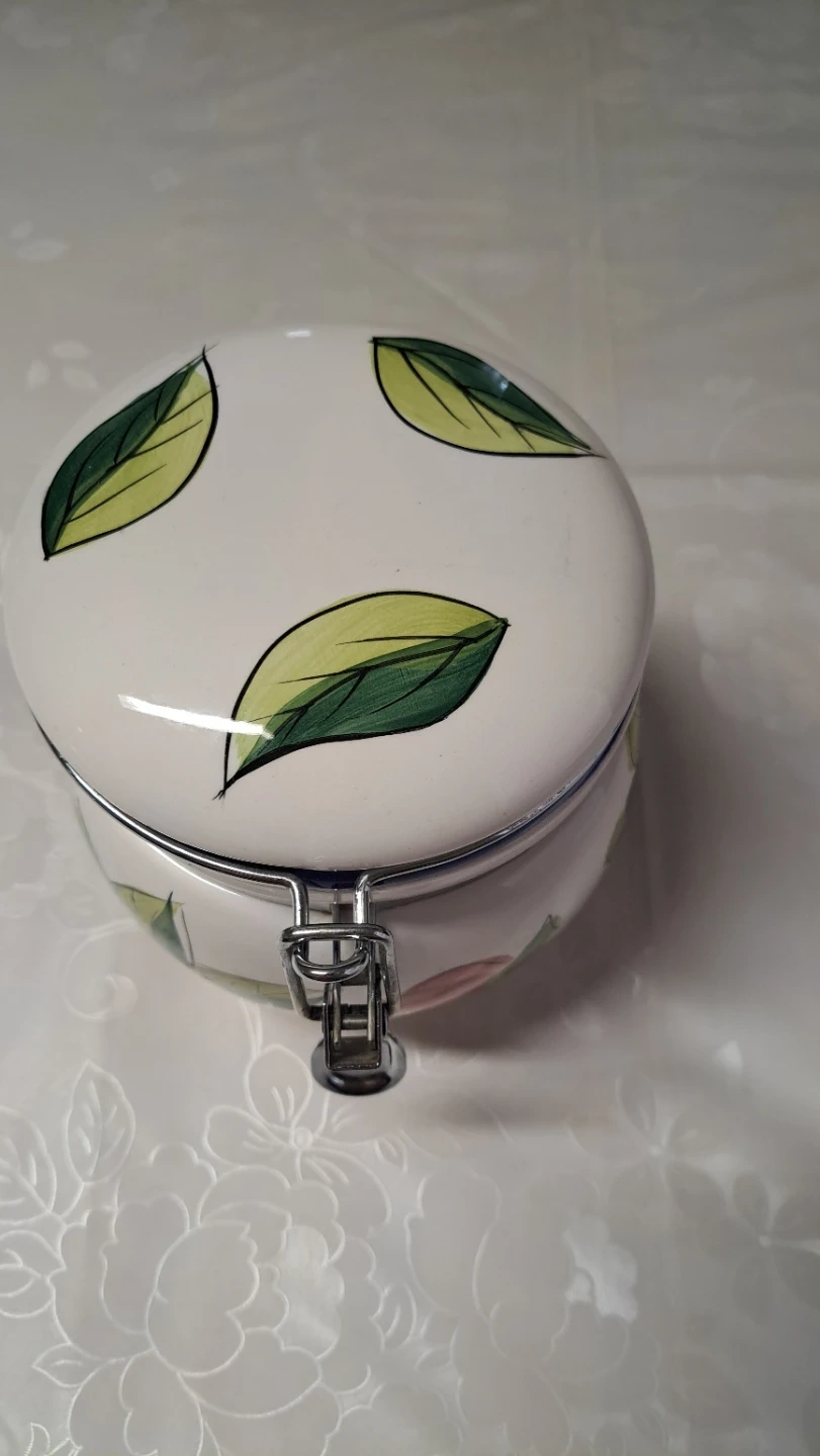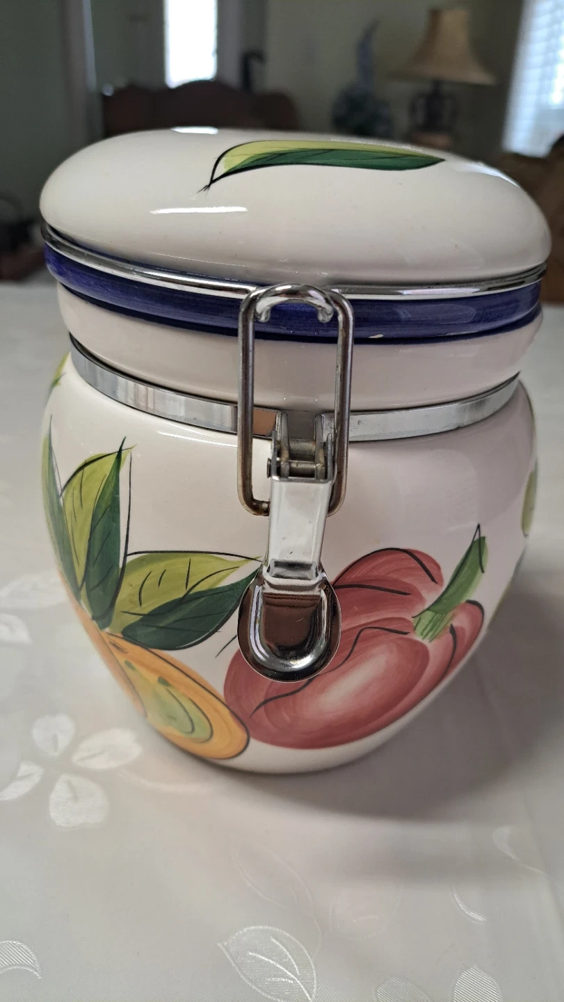 White ceramic storage jar with a decorative fruit and leaf pattern. It features a blue rim and a secure latch closure. This canister is suitable for storing dry goods or countertop items.