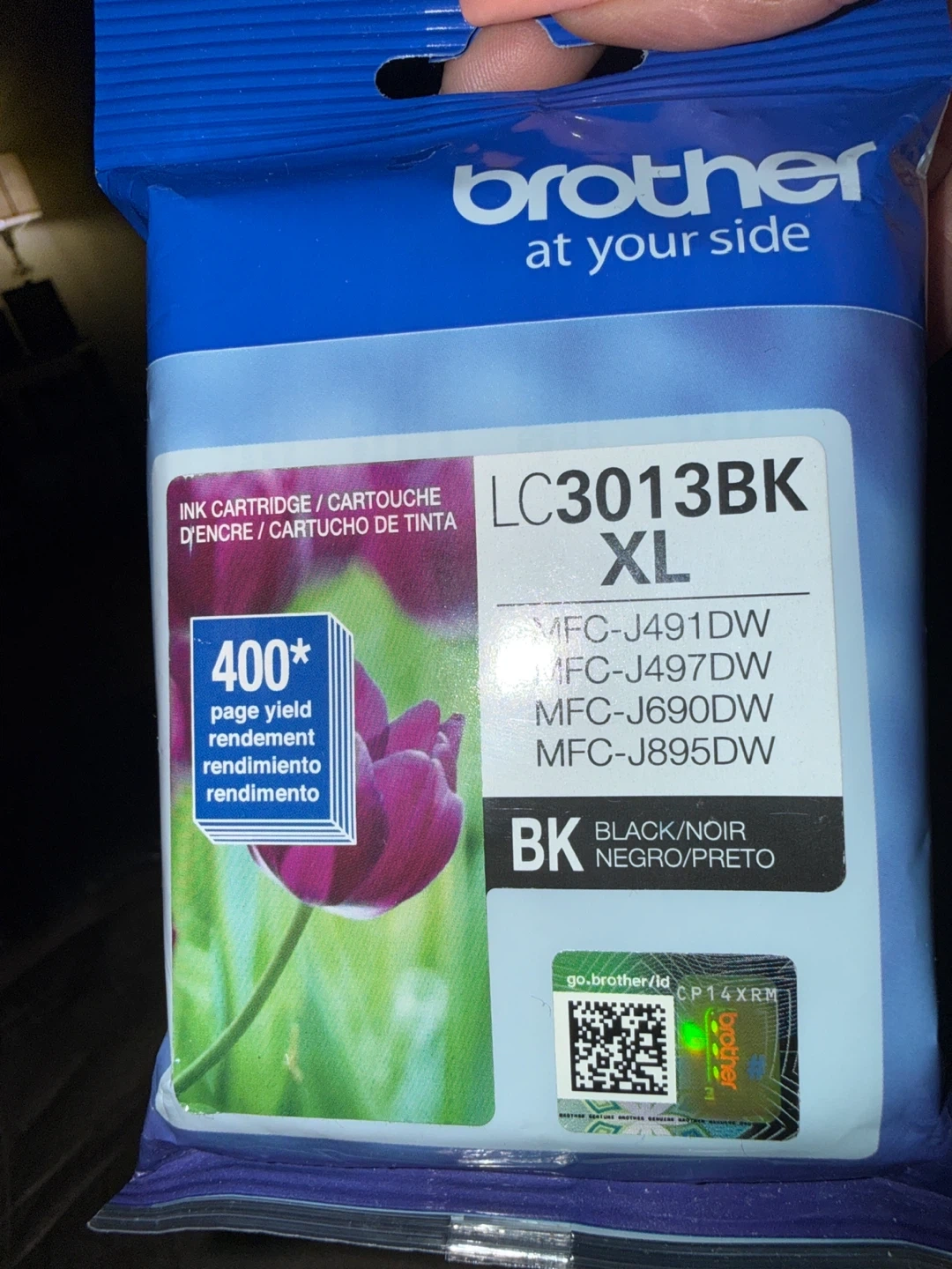 This is a Brother LC3013BK XL black ink cartridge. It's an XL size with an estimated page yield of 400 pages. Compatible with MFC-J491DW, MFC-J497DW, MFC-J690DW, and MFC-J895DW printers. Expiration date is 2028.01.