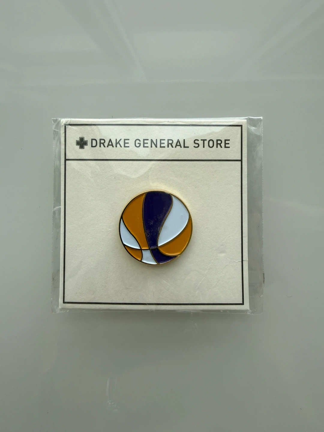 This Drake General Store lapel pin features a basketball design. It's attached to a card and sealed in plastic. Great for adding a touch of sports flair to your jacket or bag!
