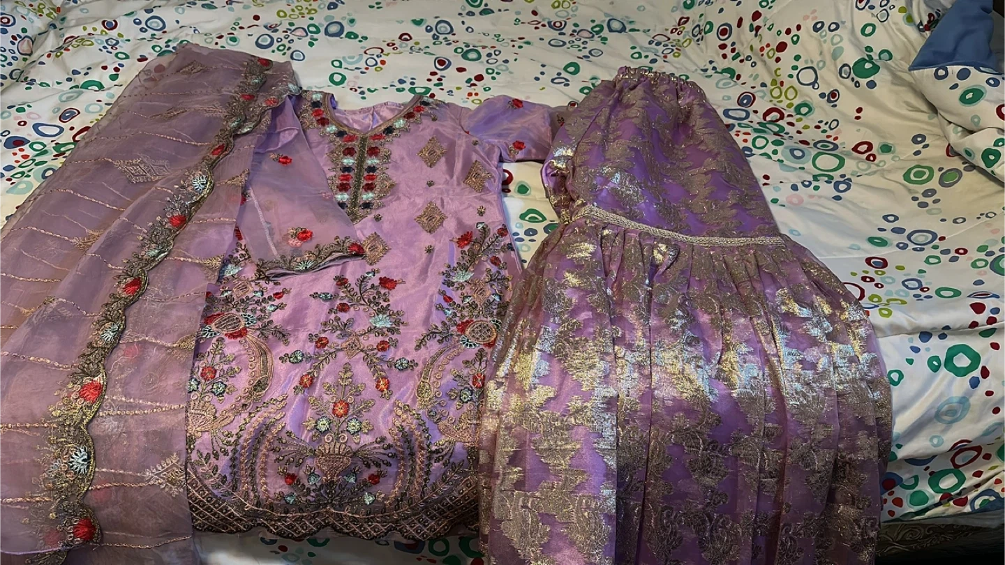 Two beautiful embroidered salwar kameez suits. One is a vibrant lilac with intricate gold patterns and colourful embellishments. The other is a soft peach with detailed floral embroidery. Both come with matching dupattas.