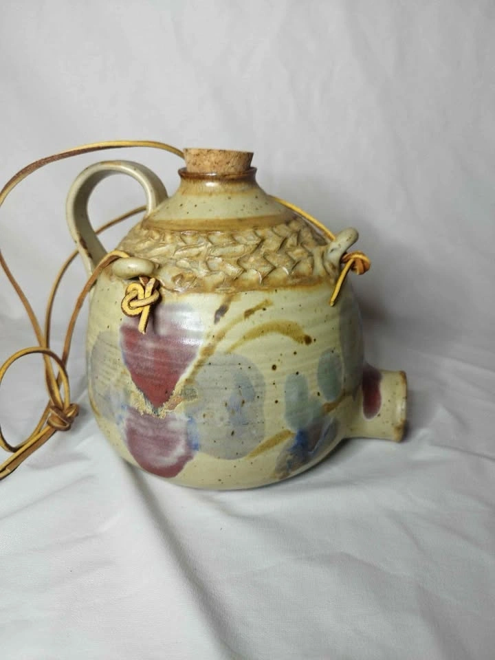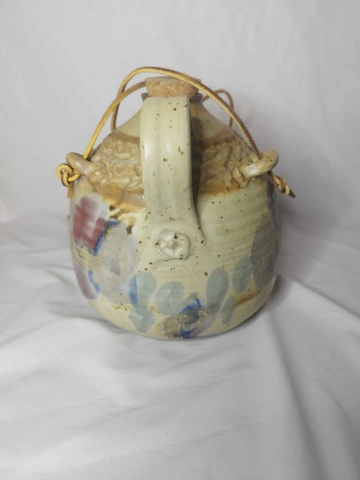 Unique handmade ceramic jug with a cool, colorful glaze. It has two cork stoppers, one for the main opening and one for the spout, and features a leather strap detail. This piece has a rustic art pottery vibe.