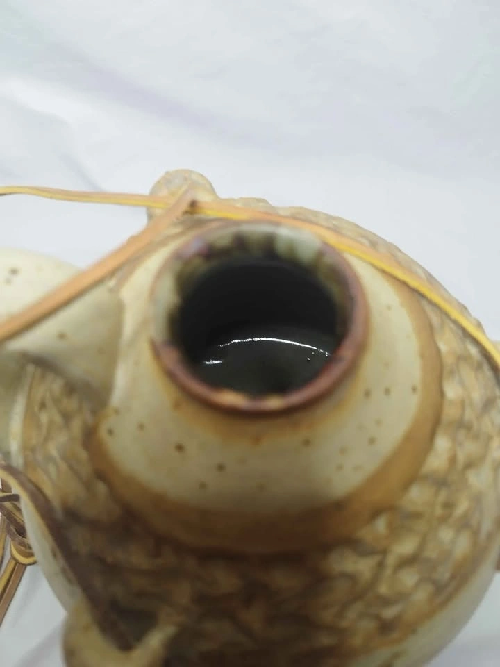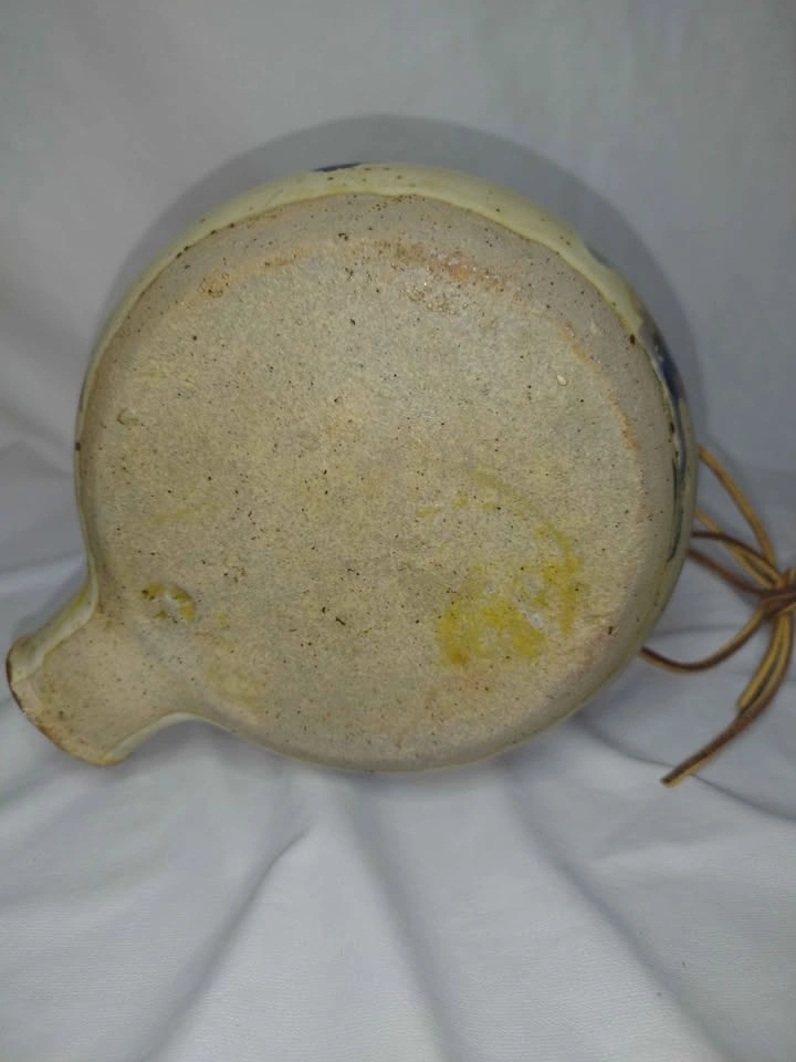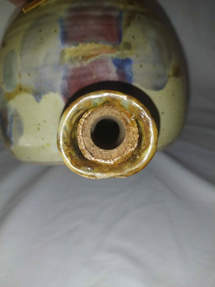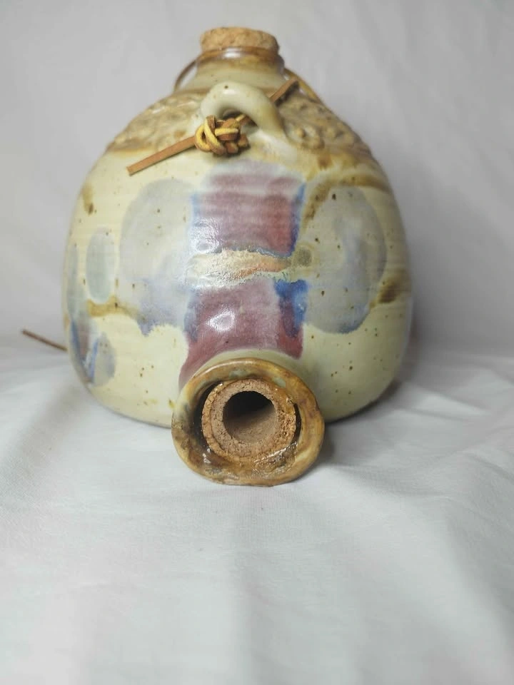 Unique handmade ceramic jug with a cool, colorful glaze. It has two cork stoppers, one for the main opening and one for the spout, and features a leather strap detail. This piece has a rustic art pottery vibe.