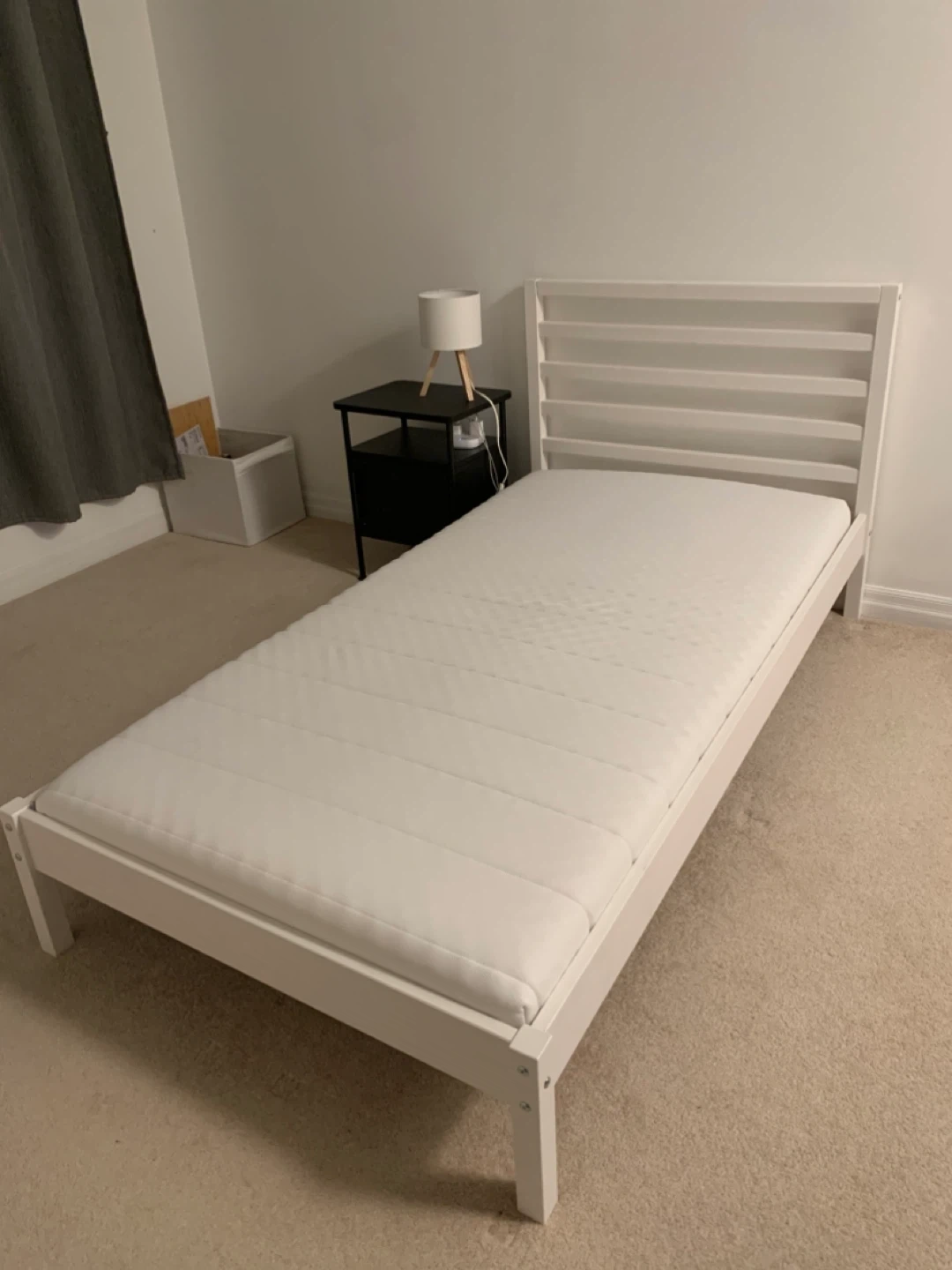 White twin bed frame, comes with a white mattress. Simple slatted headboard design.