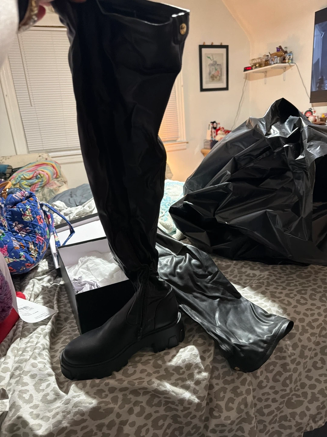 Selling a pair of black thigh-high boots! They are in great condition and come with the box. These boots are perfect for adding a stylish touch to any outfit