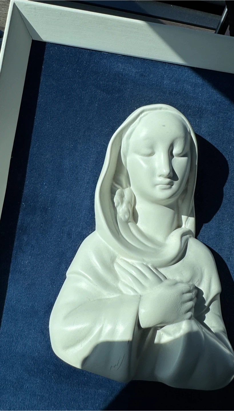 White relief sculpture of Mother Mary with a veil against a blue velvet background. It's framed in a white border. This piece could bring a sense of peace to a room.