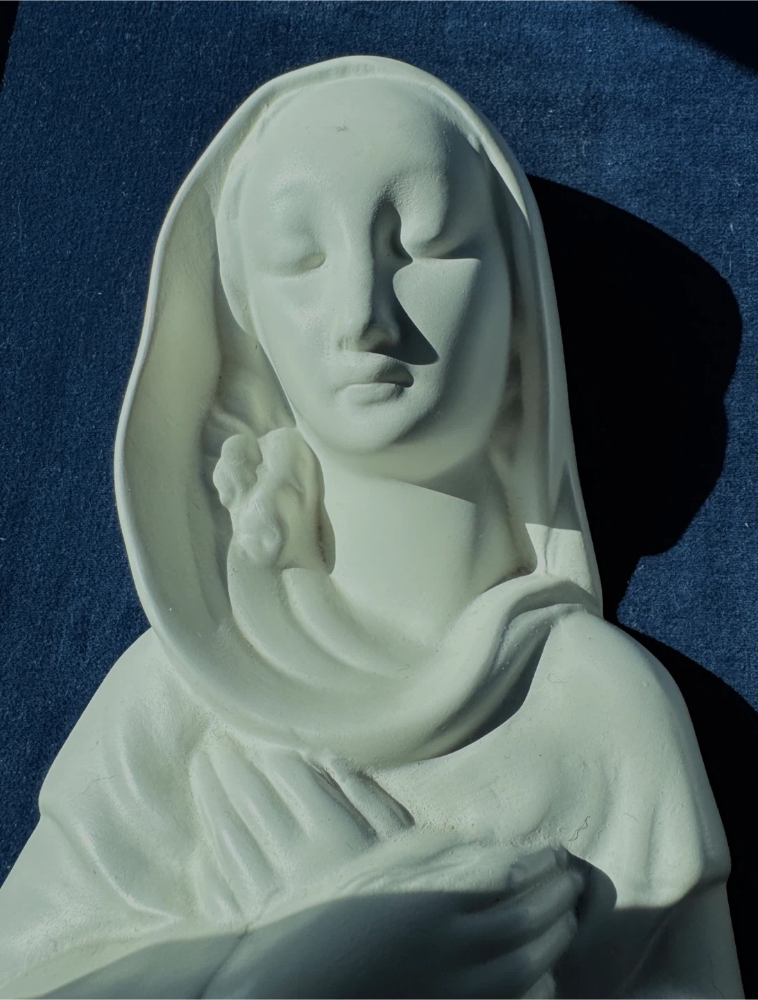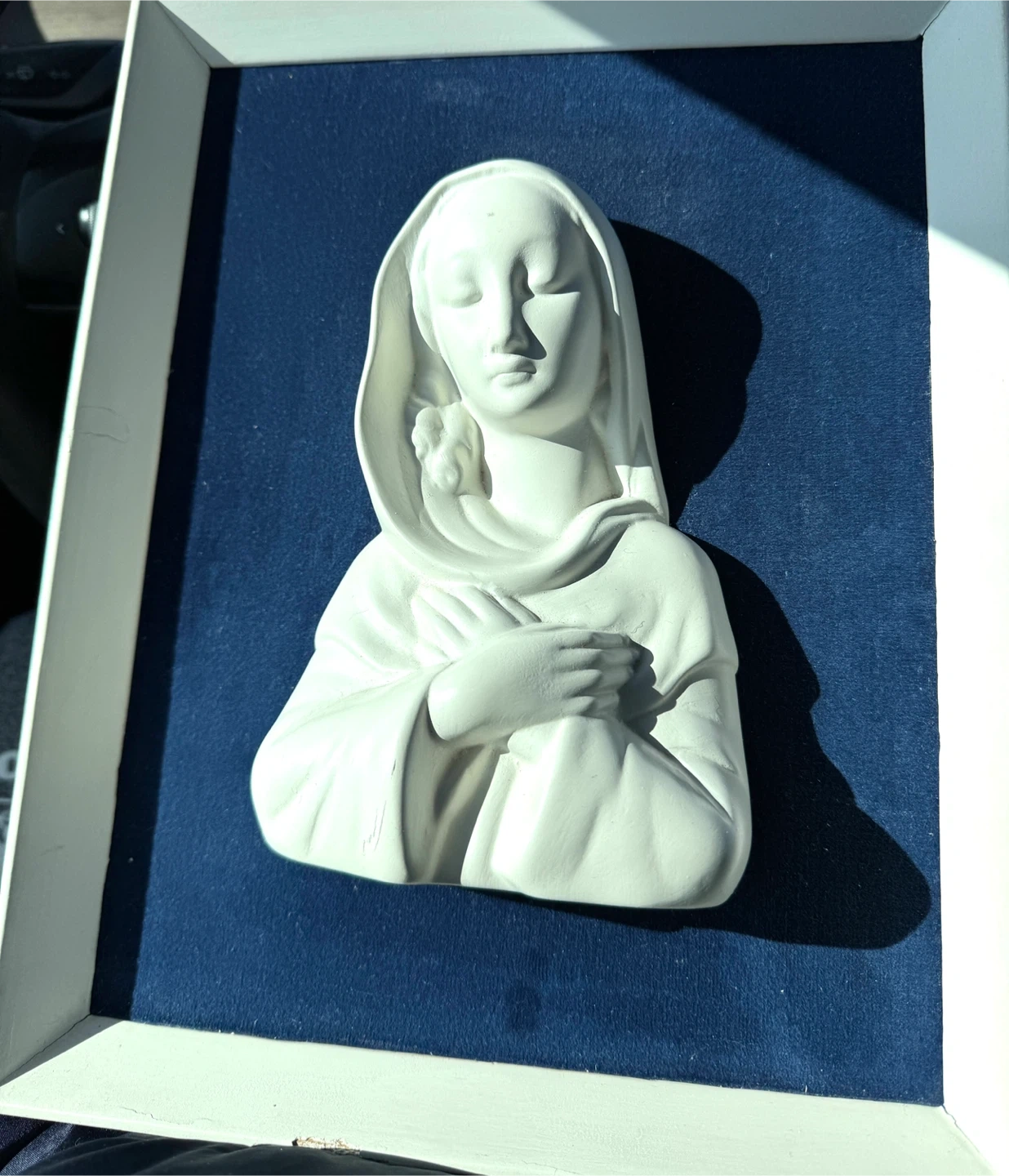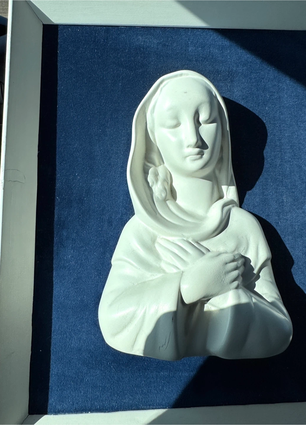 White relief sculpture of Mother Mary with a veil against a blue velvet background. It's framed in a white border. This piece could bring a sense of peace to a room.