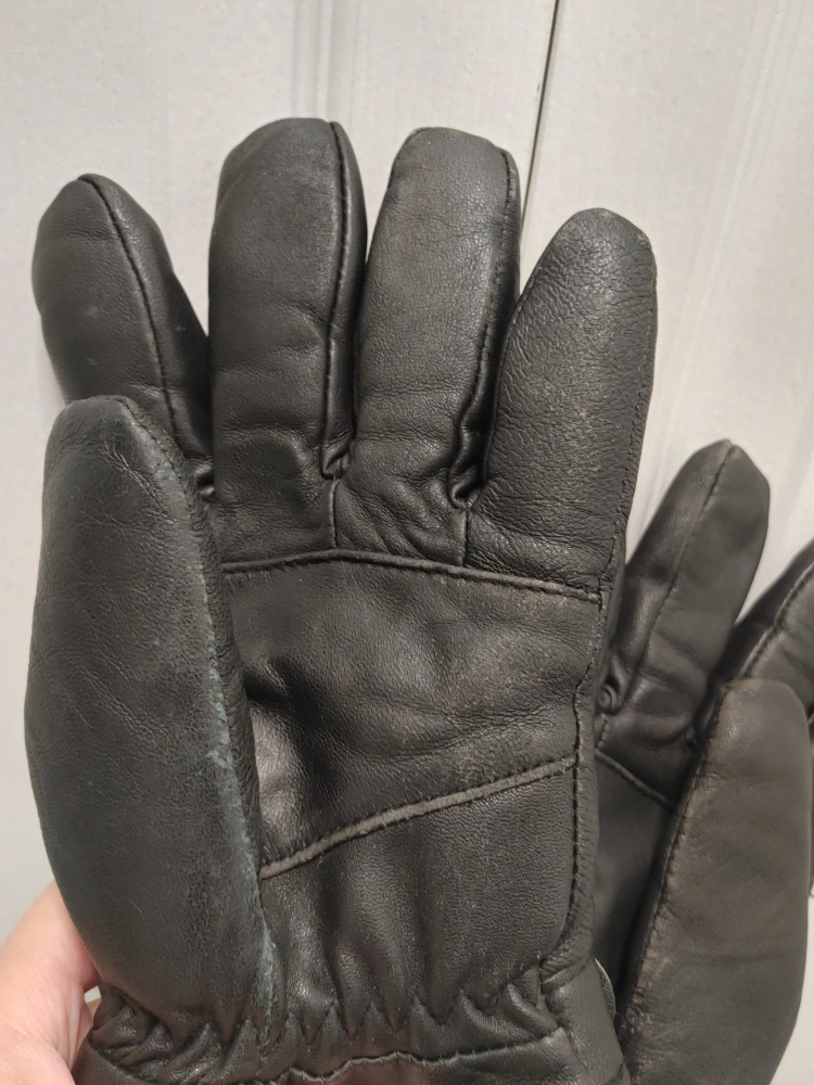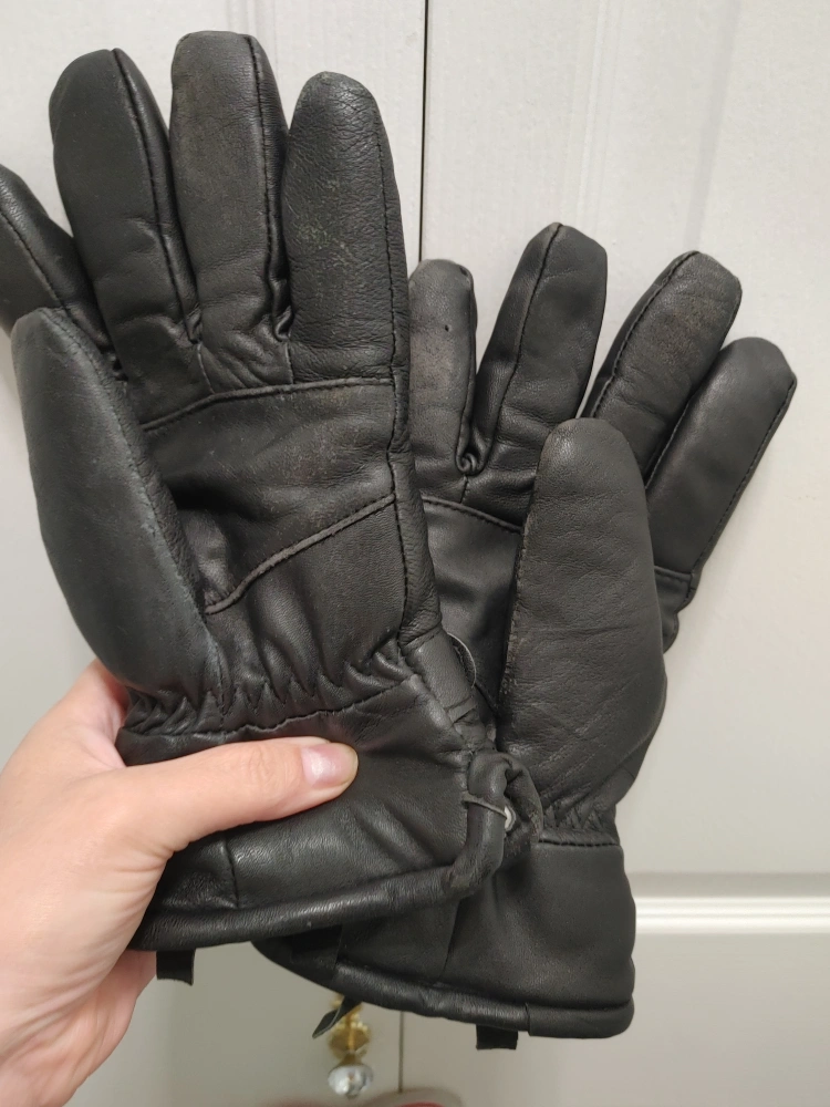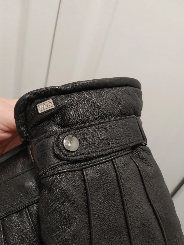 Here are some black 100% goatskin leather gloves! They have a buckle design on the wrist and a soft lining inside. Good for keeping your hands warm during the colder months
