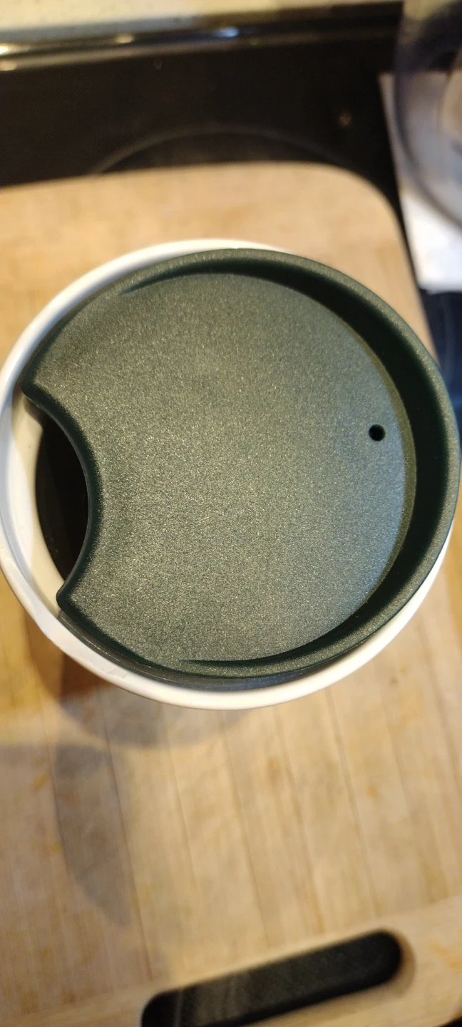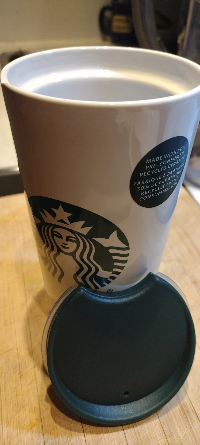 This Starbucks travel mug is made with 30% pre-consumer recycled ceramic. It's a reusable mug, perfect for your daily commute or when you're on the go. The lid helps prevent spills.