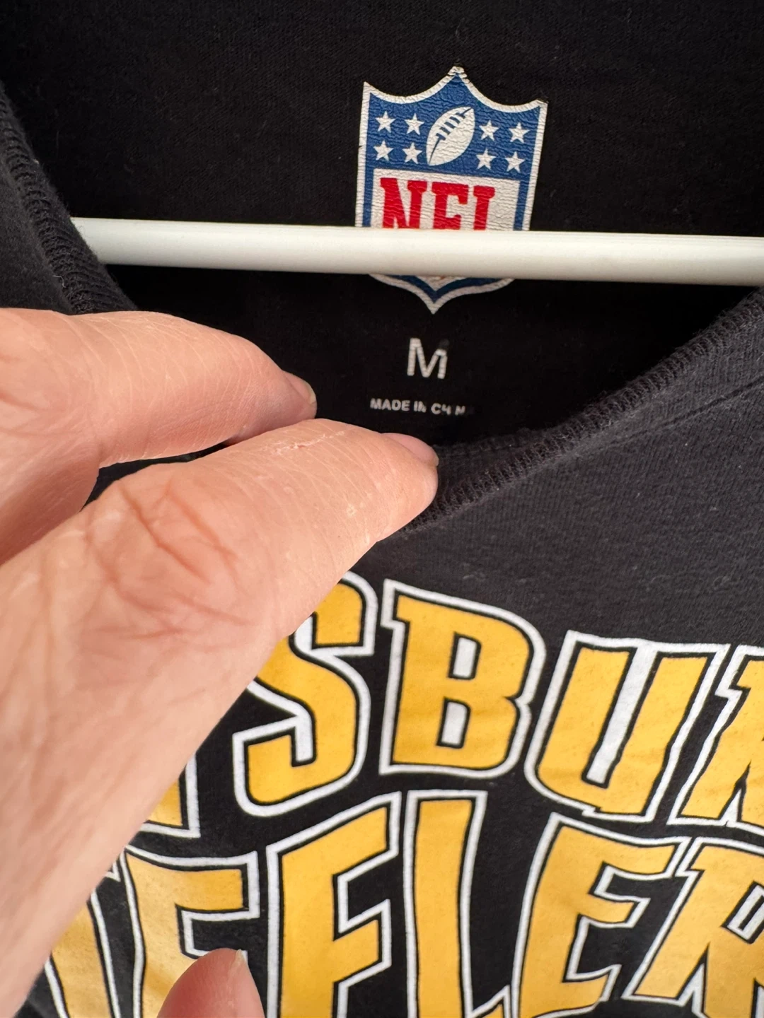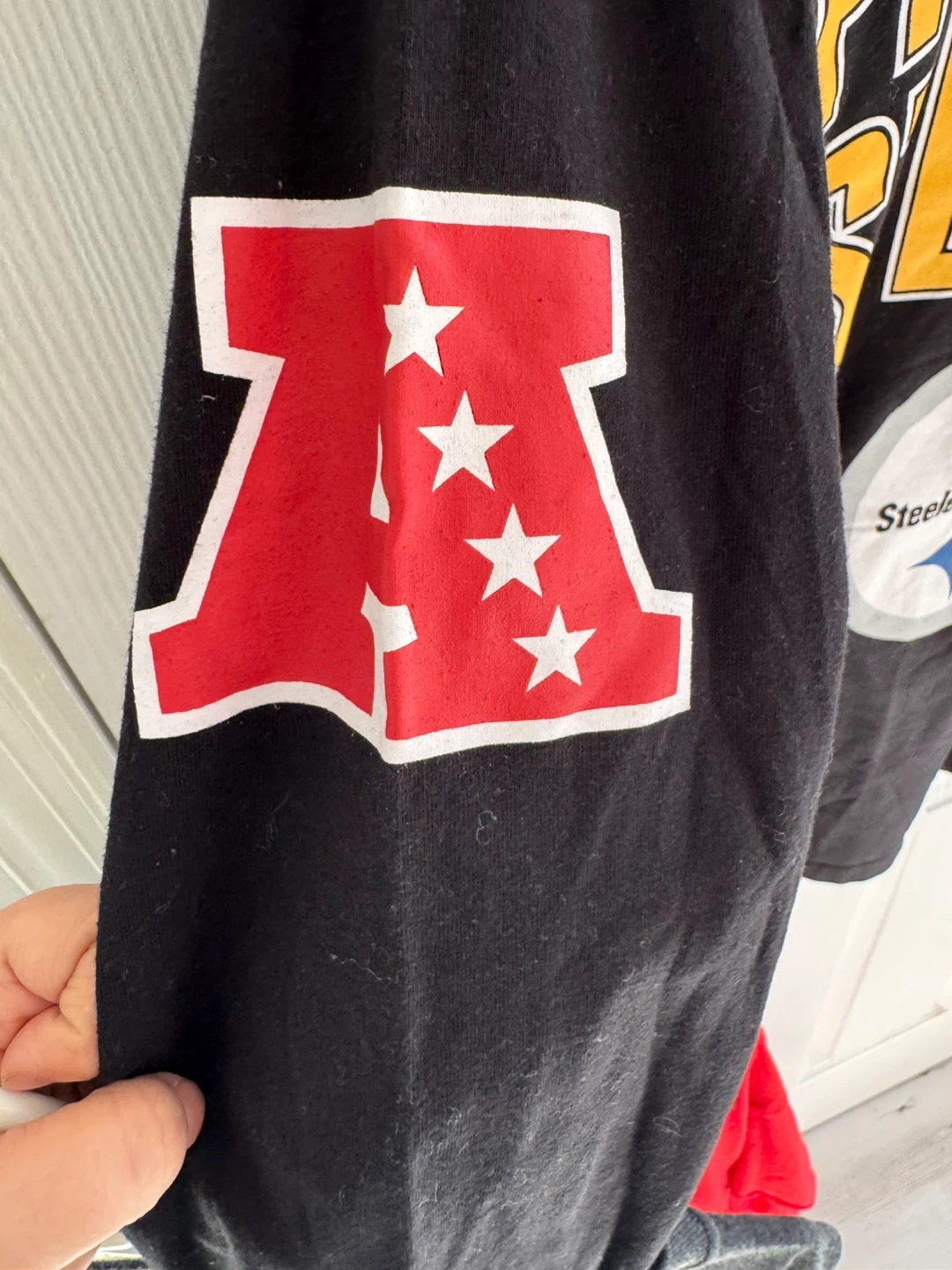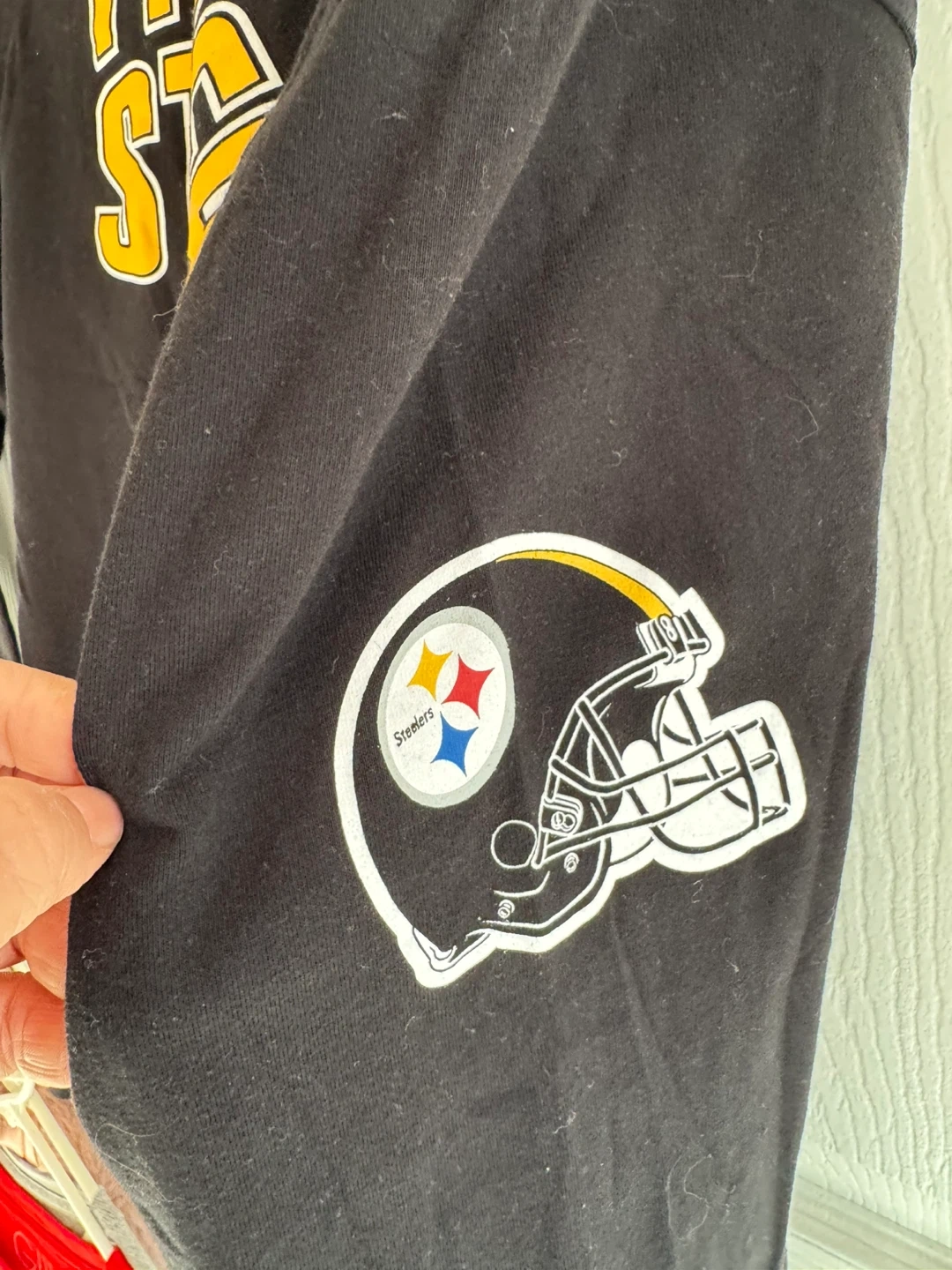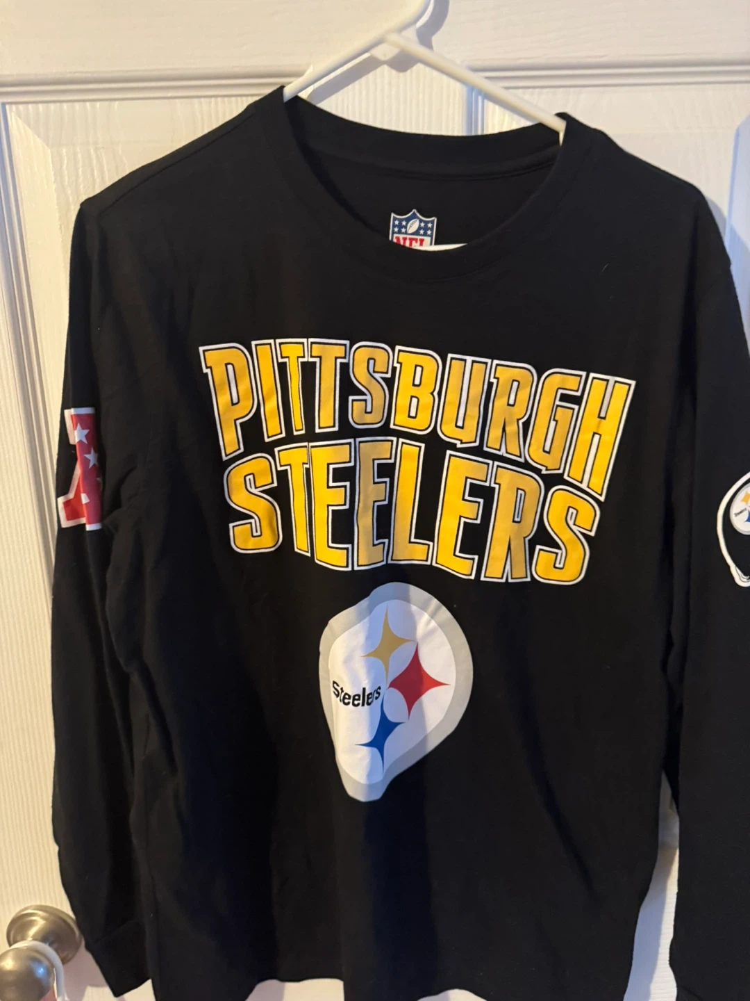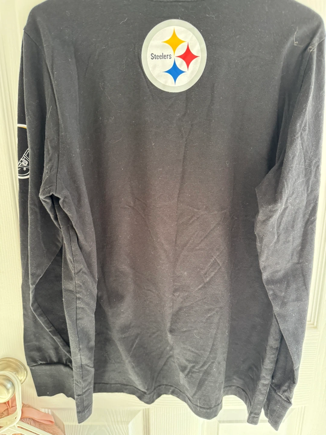 Selling a Pittsburgh Steelers long sleeve shirt. It's an NFL licensed product in size medium. The shirt is black with the Steelers logo on the front and sleeve. It has some signs of wear but is still in good condition!