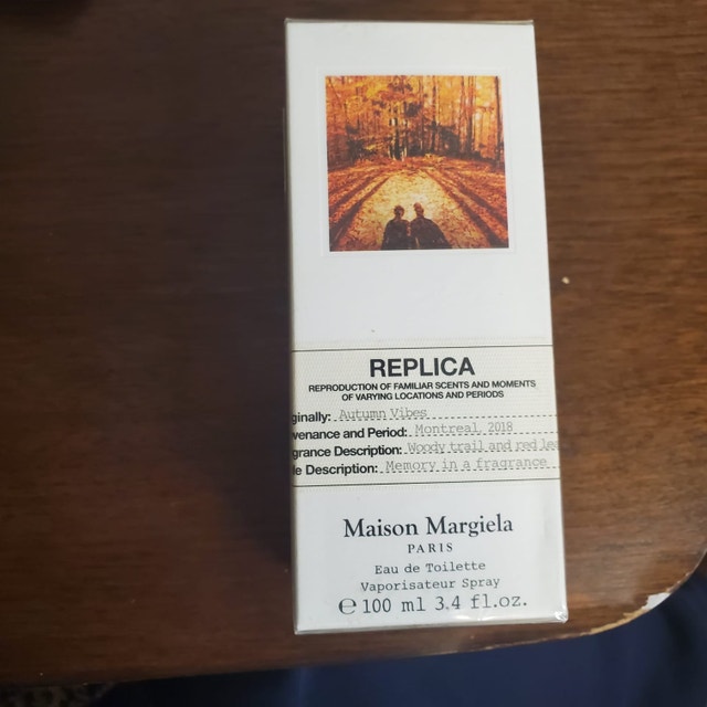 Maison Margiela Autumn Vibes 100ml, a woody and warm fragrance that captures the essence of a crisp autumn day with notes of red berries, cedar, and moss, evoking memories of colourful foliage and cozy moments. Here are some details: * **Scent Profile:** Woody, warm, and spicy. * **Top Notes:** Red Berries, Coriander. * **Heart Notes:** Cedarwood, Nutmeg. * **Base Notes:** Moss, Fir Balsam.