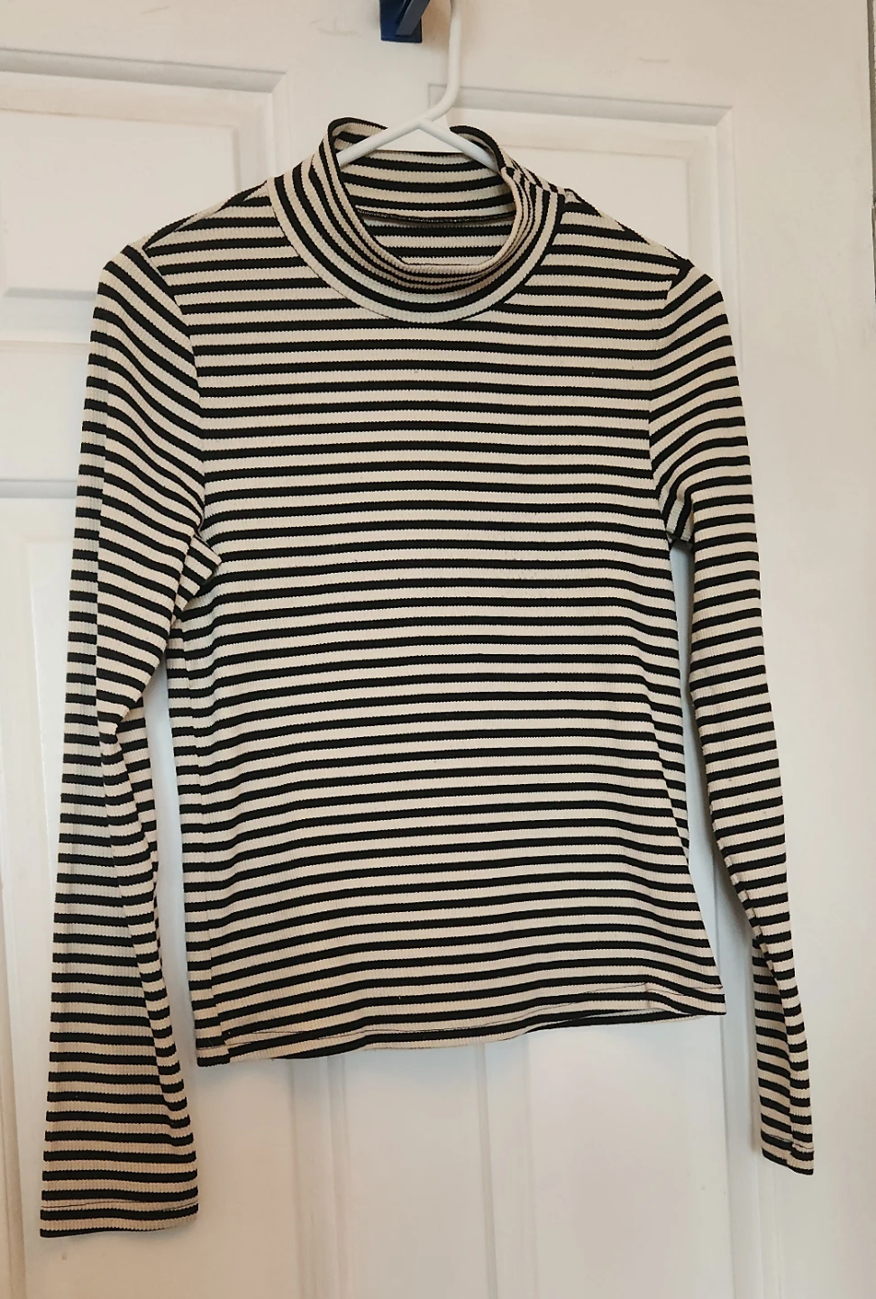 Selling a Dazy striped turtleneck top in size medium! It features a classic black and white striped pattern and a comfortable turtleneck design. Perfect for layering or wearing on its own