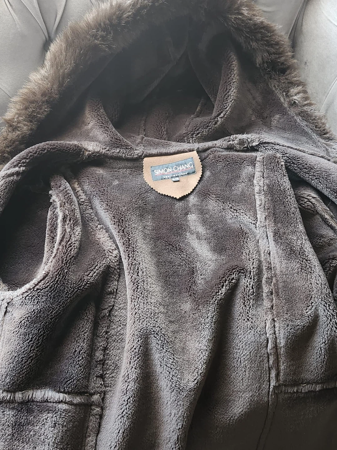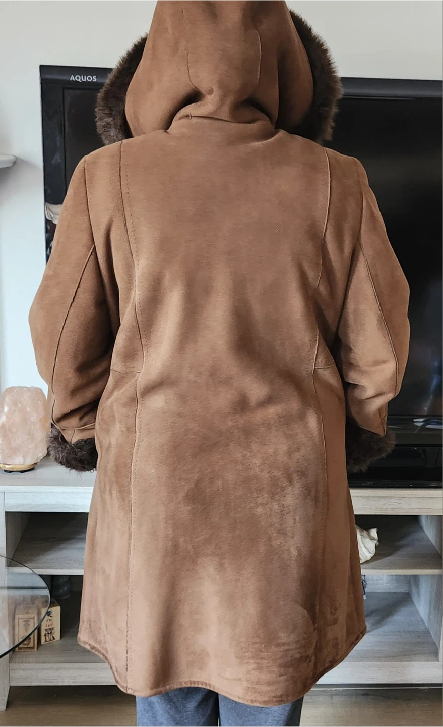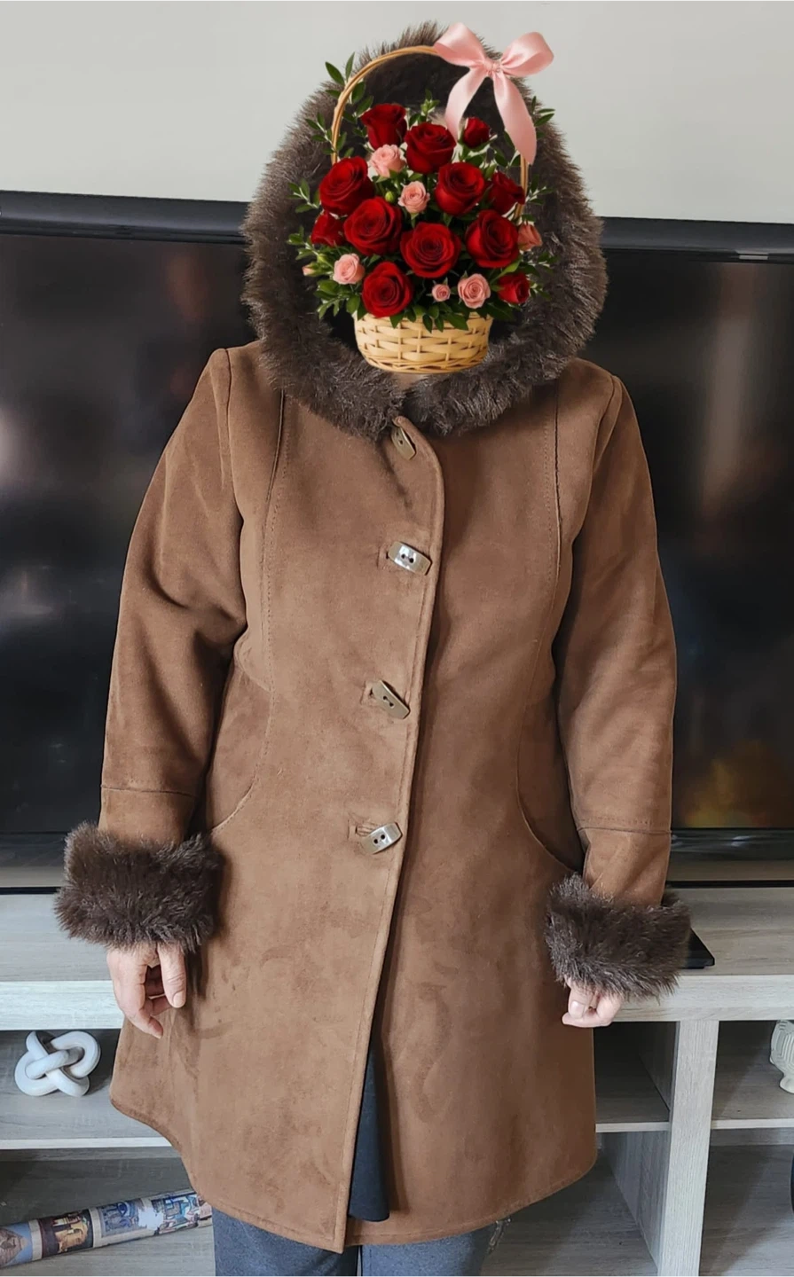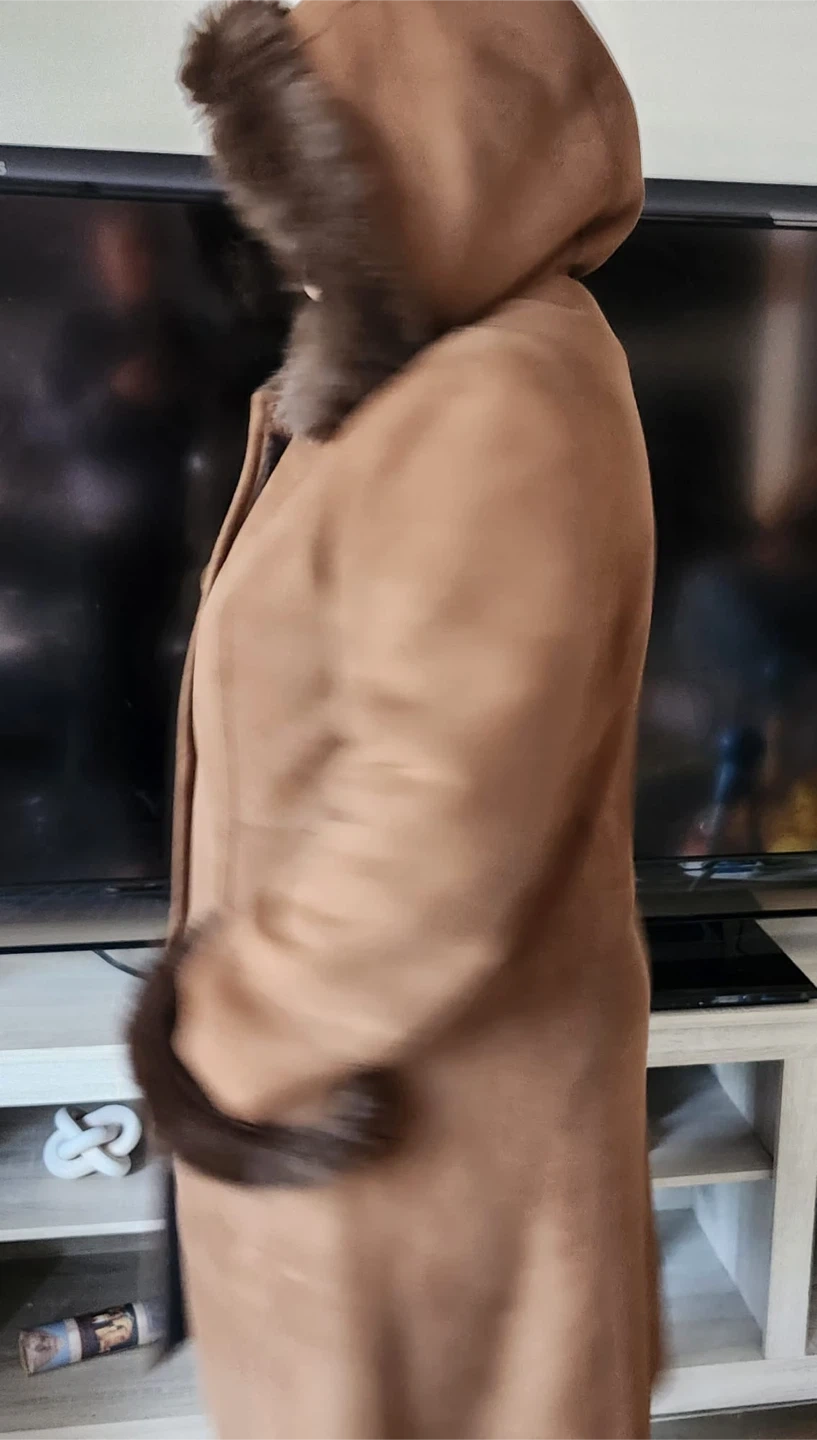 Warm brown coat with a faux suede exterior and faux fur trim on the hood and cuffs. It features toggle button closures and a cozy hood. This coat is perfect for staying stylish and warm during colder weather!