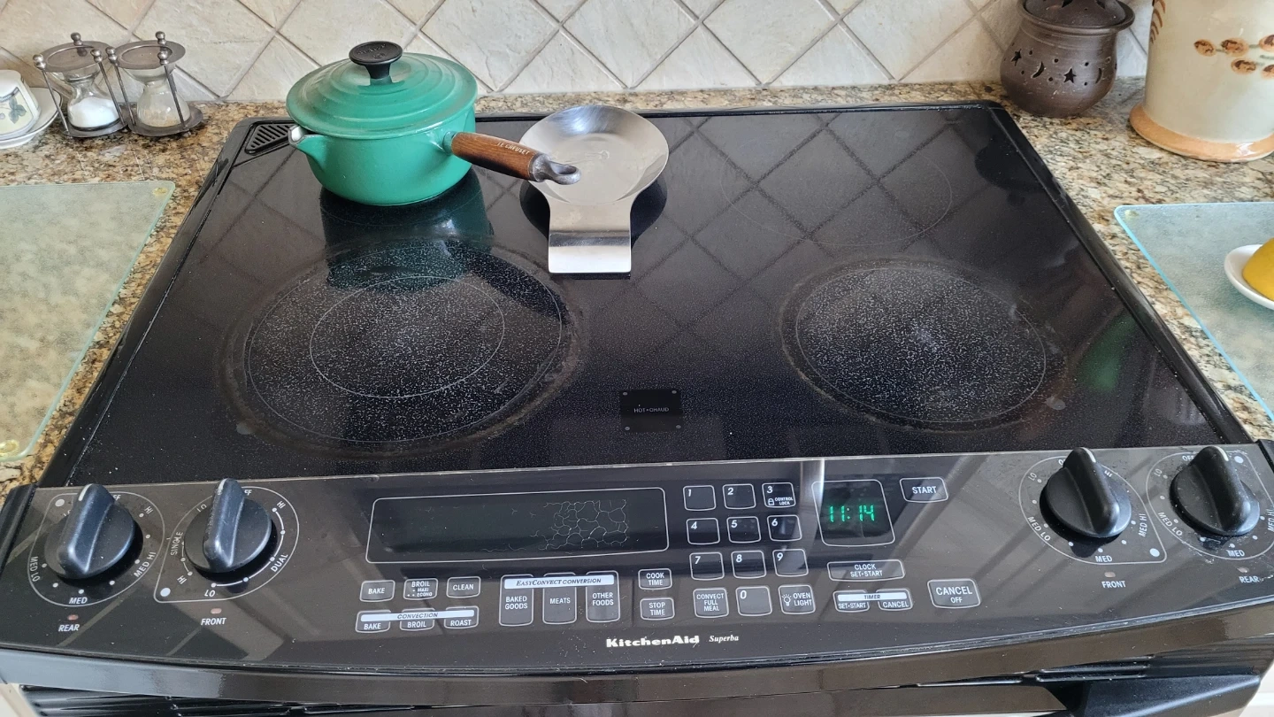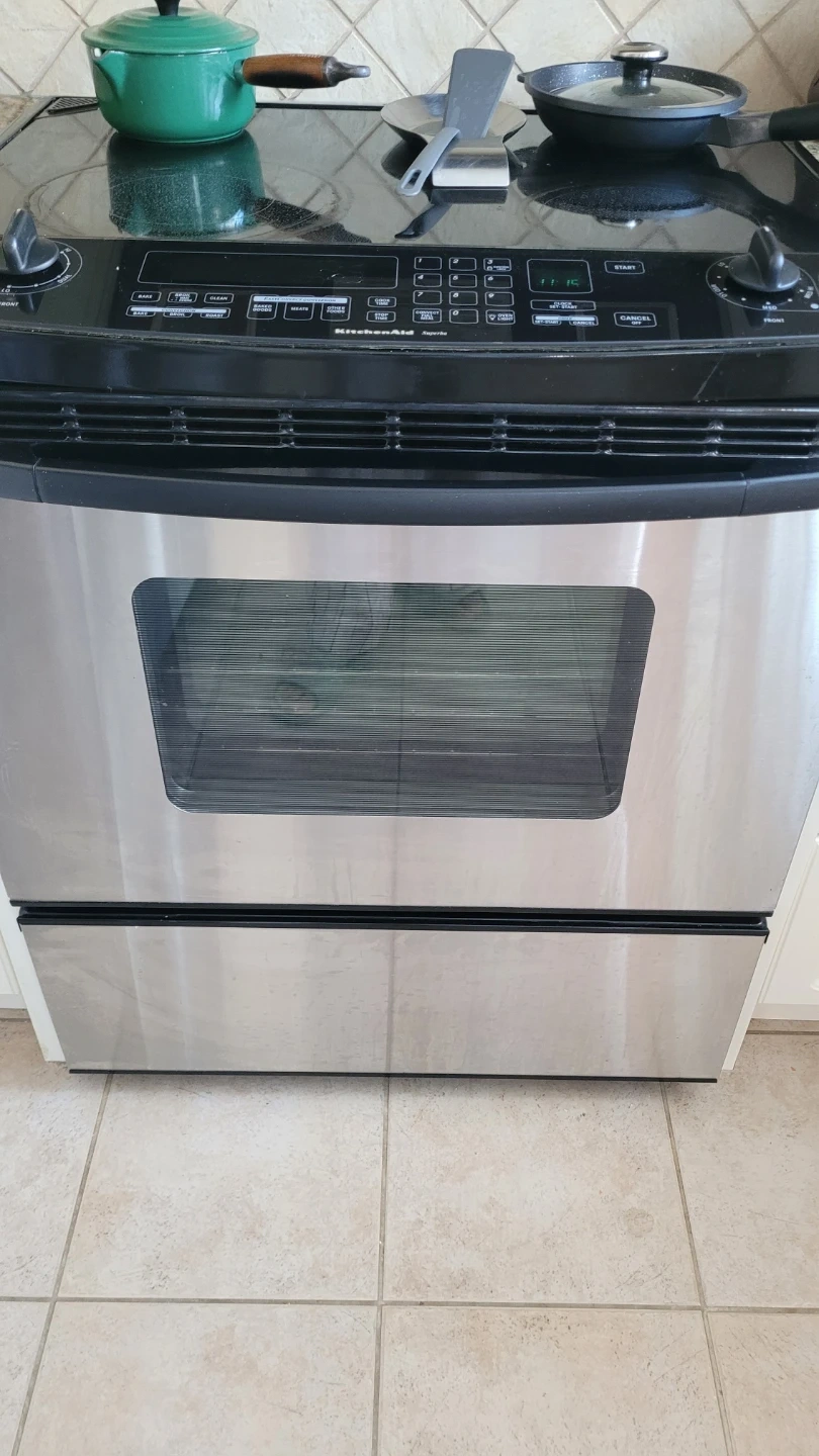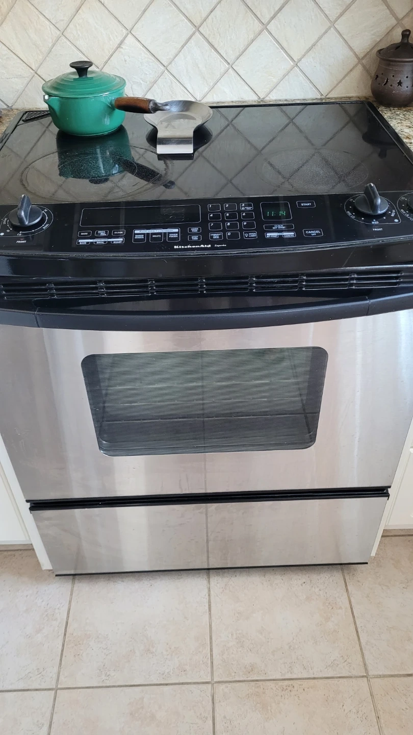 This KitchenAid electric range has a smooth ceramic cooktop and a spacious oven. It includes a broil pan and rack. This range is great for everyday cooking needs.