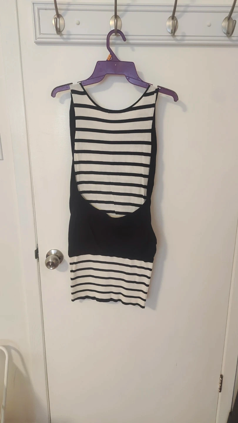 This Mimi & Lily tank top has a black overlay with a cowl neck design. It features a black and white striped body and back. It's a comfortable and stylish piece for layering or wearing on its own.