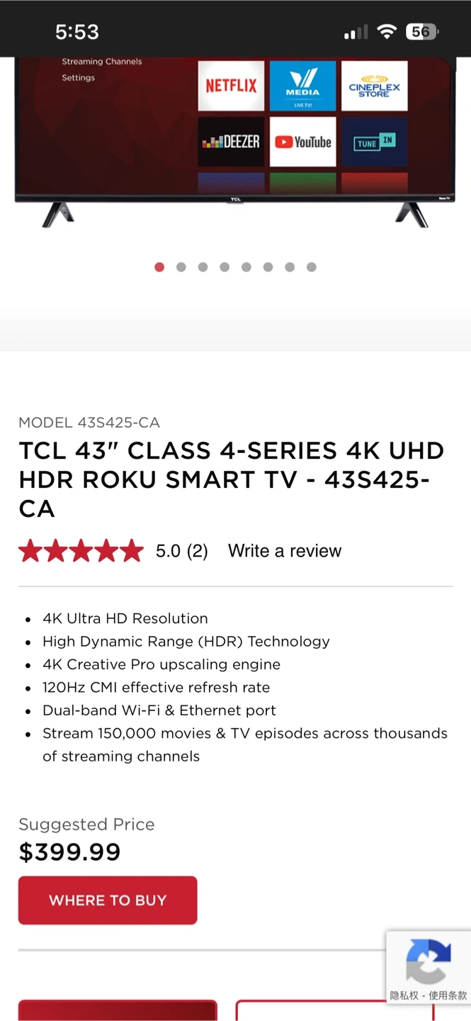 TCL 43" Class 4-Series 4K UHD HDR Roku Smart TV 43S425
