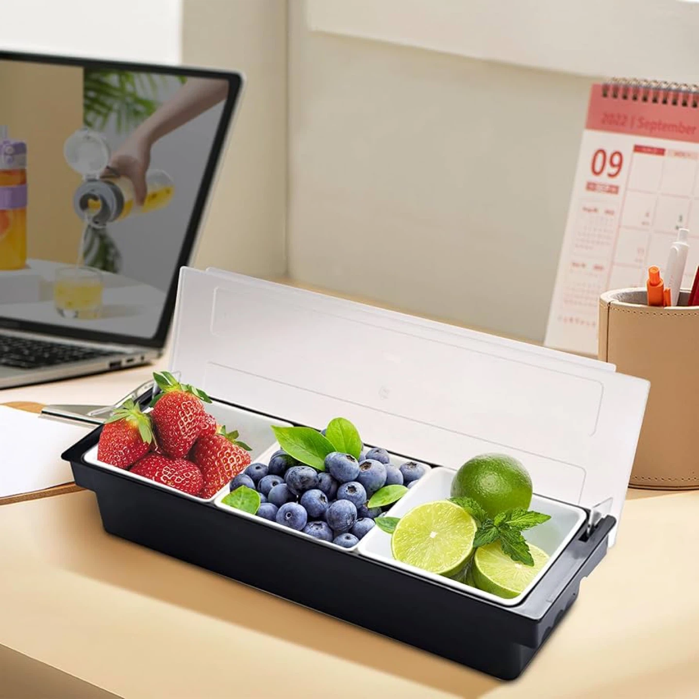 Keep Food Fresh - Ice cooled caddy condiment Line ice cubes on the bottom of the container to keep food cool and fresh for hours. Food and Condiment Organizer holds fruits, veggies, sauces, dips, toppings, condiments, fish, meat, and anything you want to keep fresh.