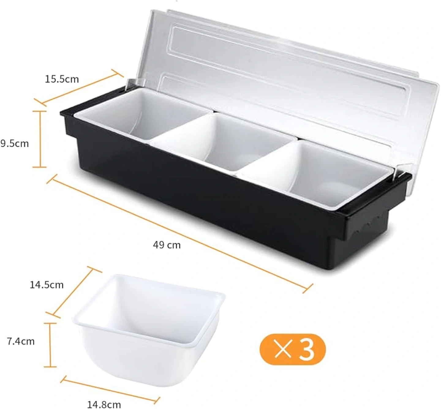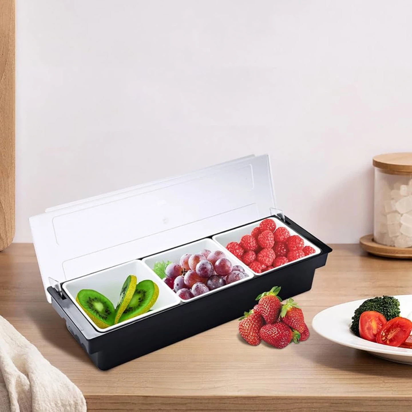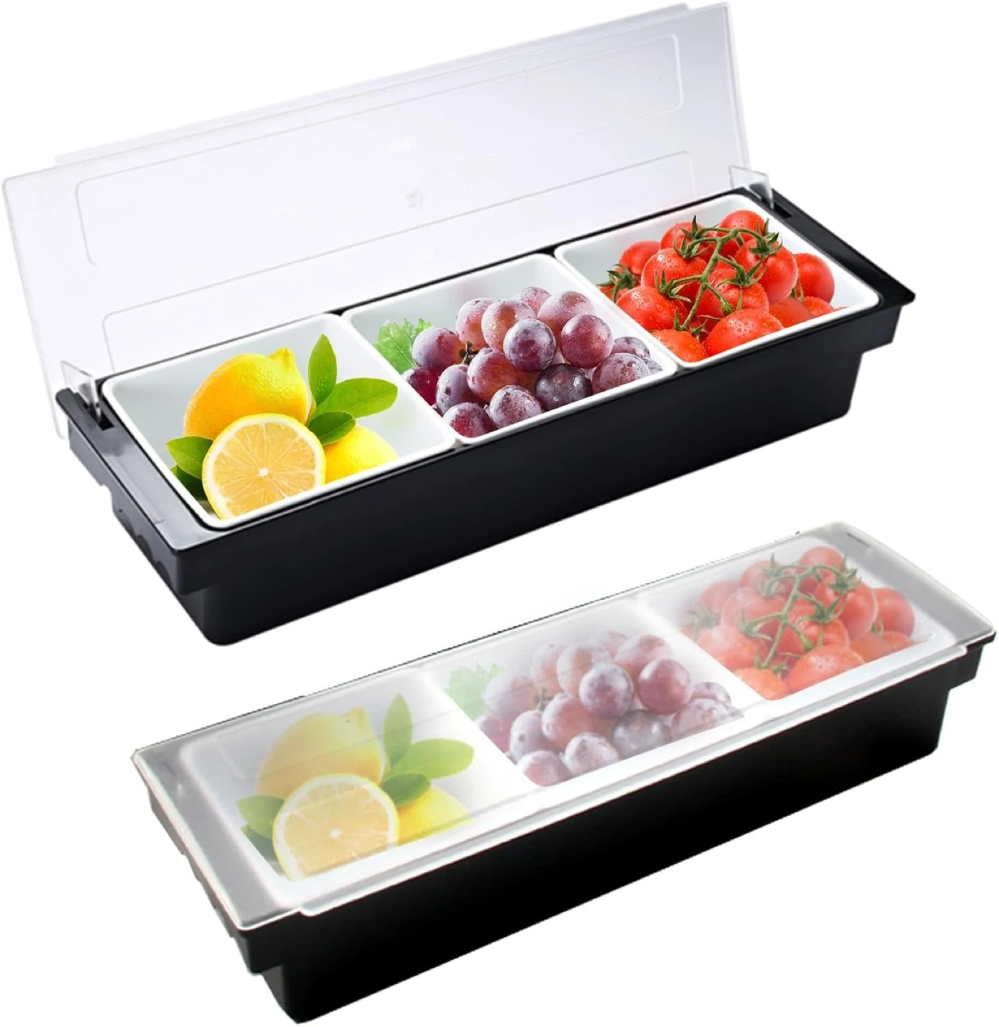Keep Food Fresh - Ice cooled caddy condiment Line ice cubes on the bottom of the container to keep food cool and fresh for hours. Food and Condiment Organizer holds fruits, veggies, sauces, dips, toppings, condiments, fish, meat, and anything you want to keep fresh.