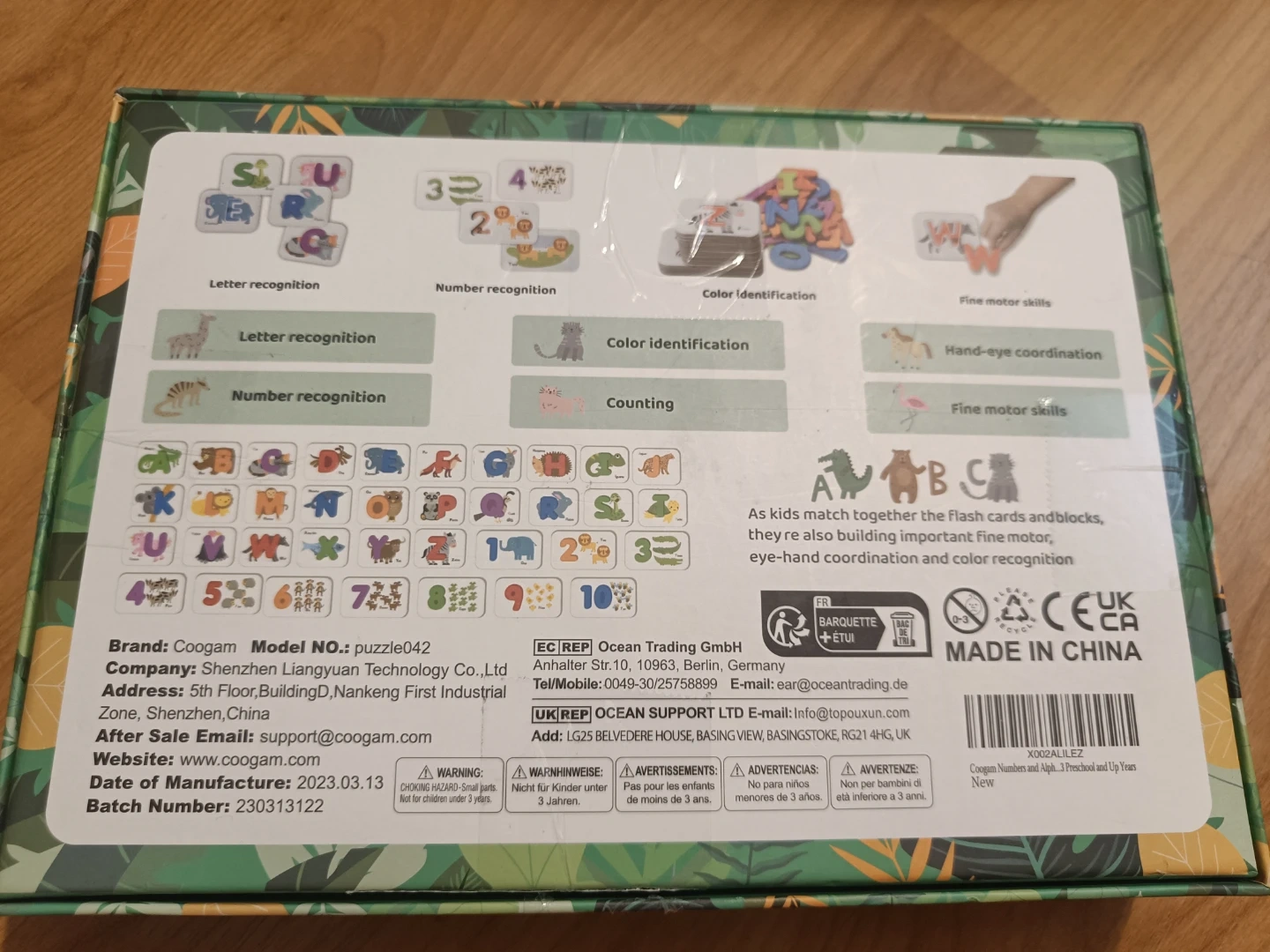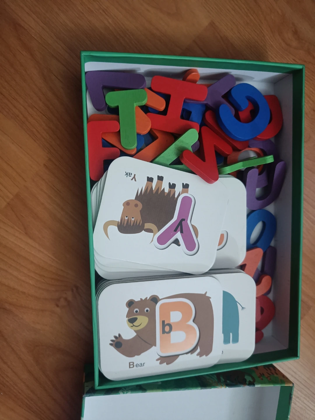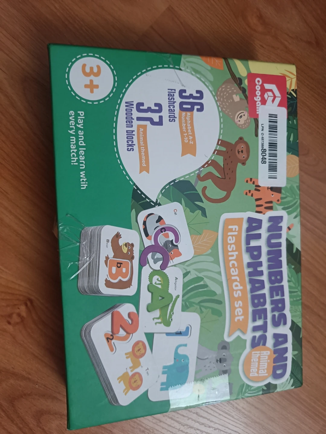 This Coogam flashcard set includes animal-themed cards and wooden letter and number blocks. It's designed for letter recognition, number recognition, and fine motor skills. Great for little ones learning their ABCs and 123s! Some parts are missing.