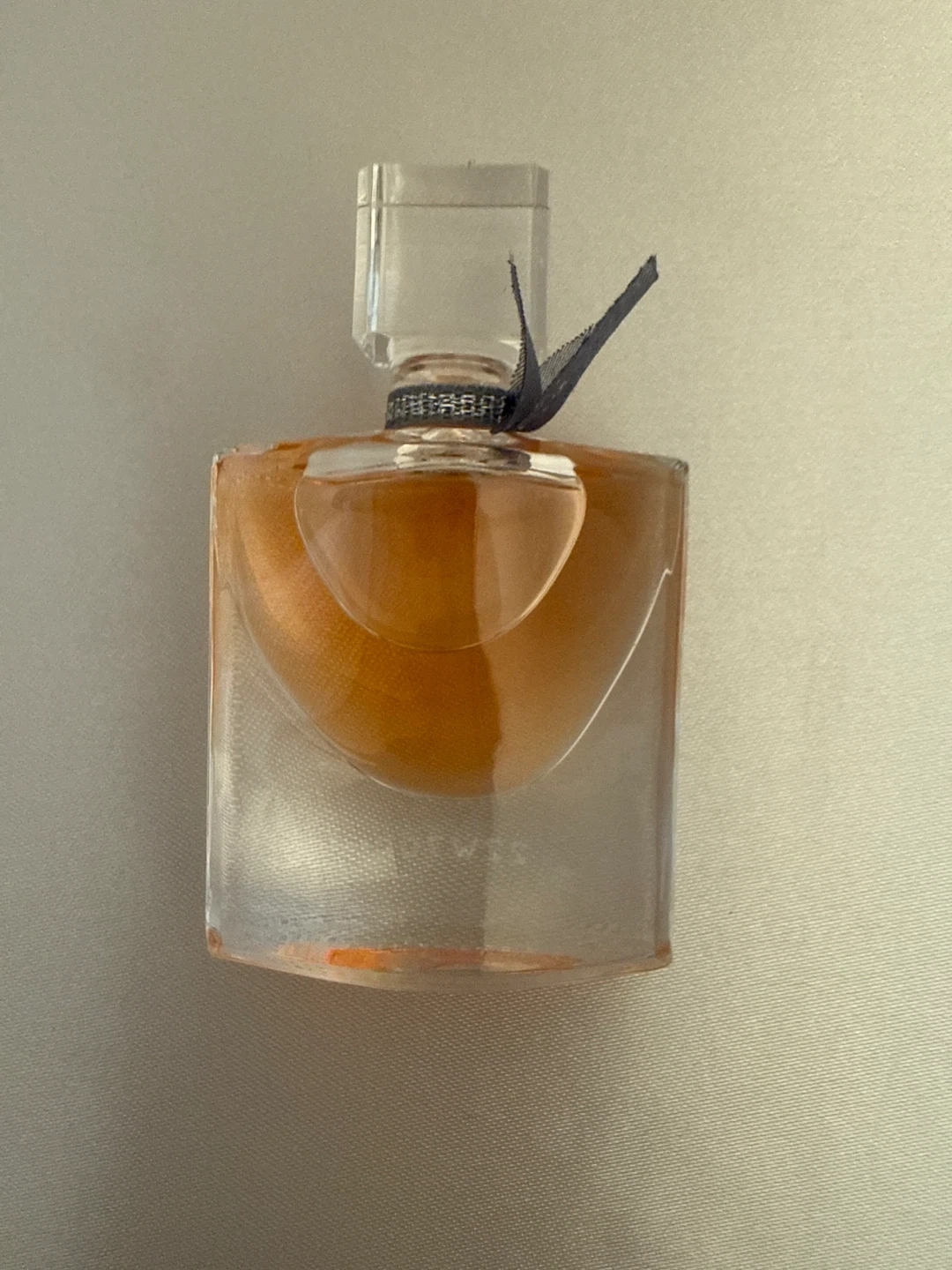 This is a bottle of Lancôme La Vie Est Belle Eau de Parfum. It's a floral fragrance with a hint of sweetness. The bottle has a ribbon detail at the neck. It is a miniature