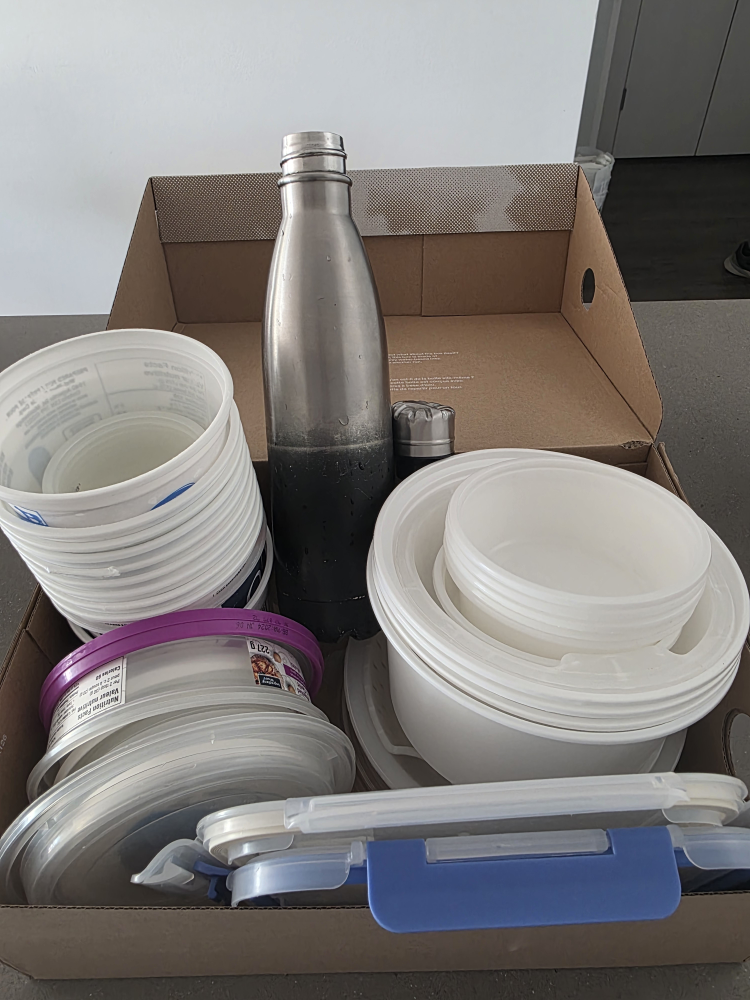 Free mixed plastic containers and a water bottle. Includes various sizes and shapes.