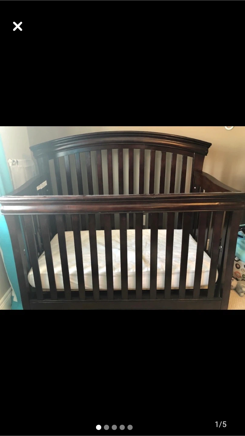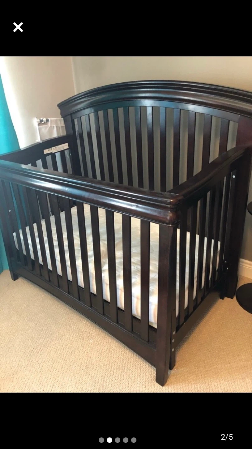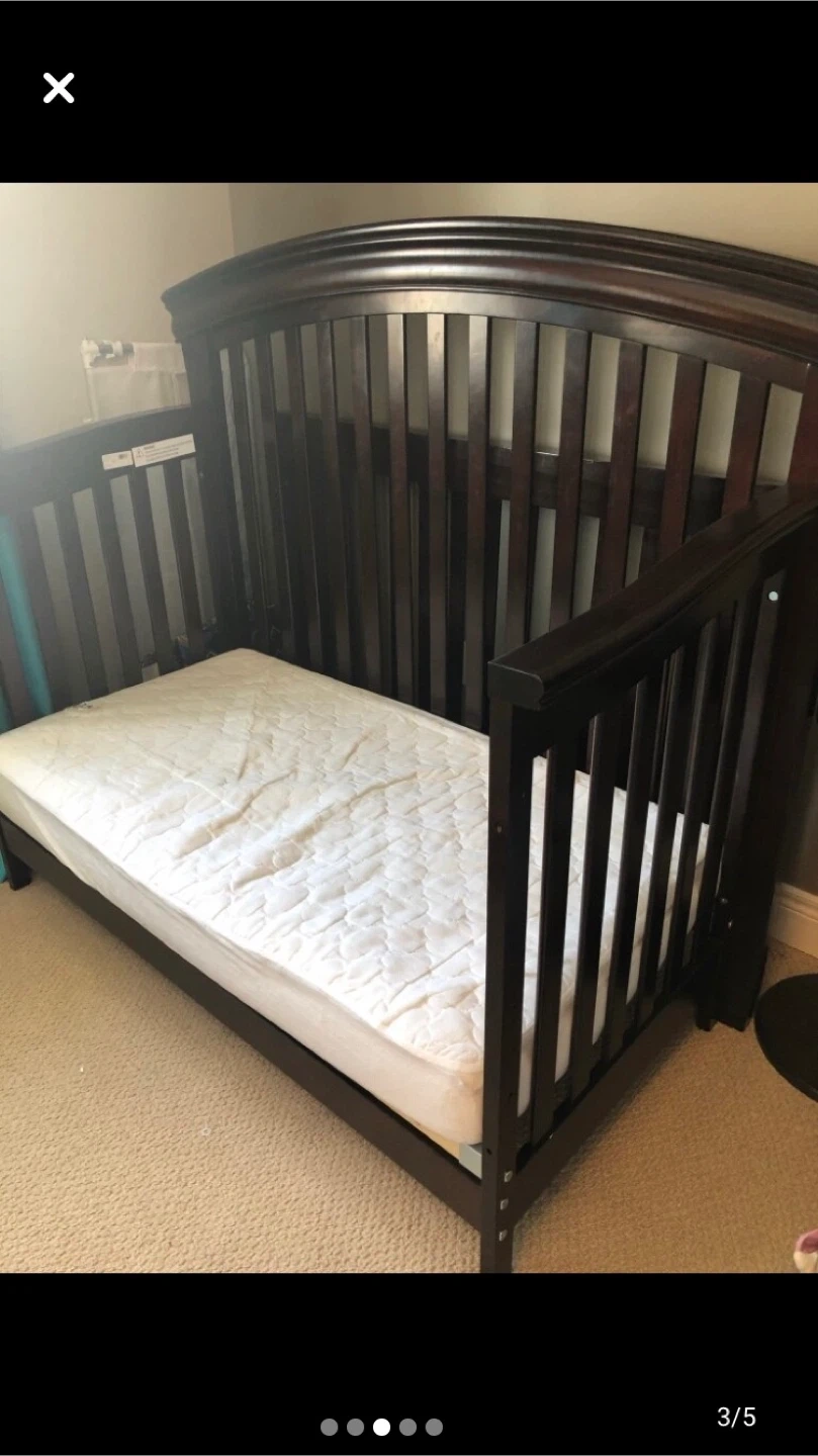 Barely used Shermag convertible crib in a rich deep brown finish, in excellent condition. Very sturdy, high-quality solid wood construction. Converts as your child grows (crib → toddler bed → daybed), making it a great long-term investment.