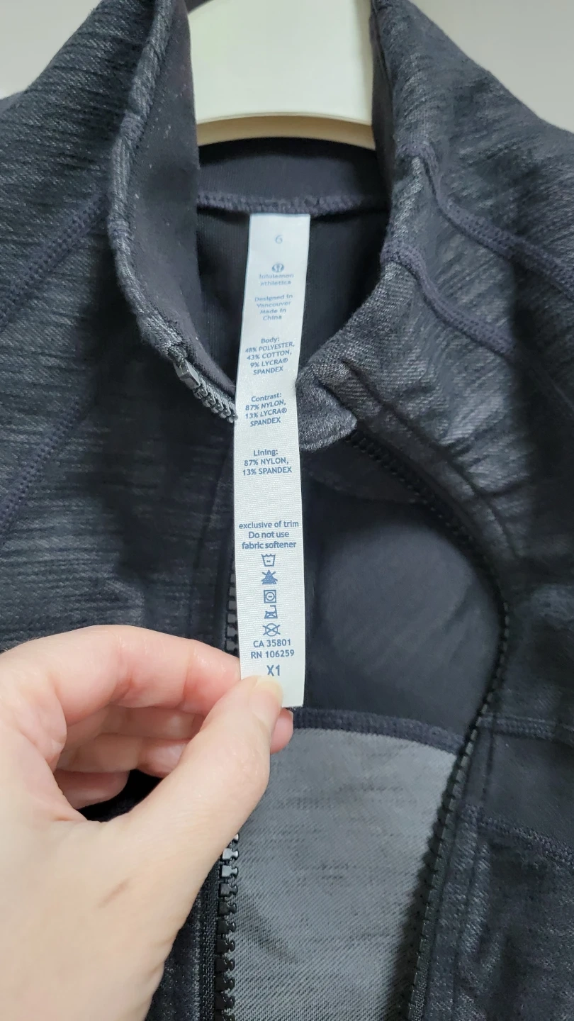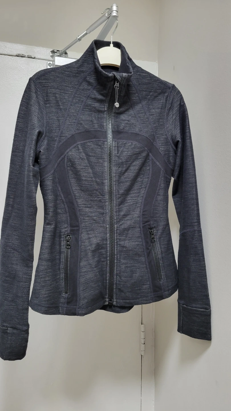 This Lululemon Athletica zip-up jacket is charcoal heather in colour. It's made with 49% Polyester, 40% Nylon, and 12% Lycra Spandex for the body. The lining is 87% Polyester and 13% Spandex. It features thumbholes and zippered pockets.