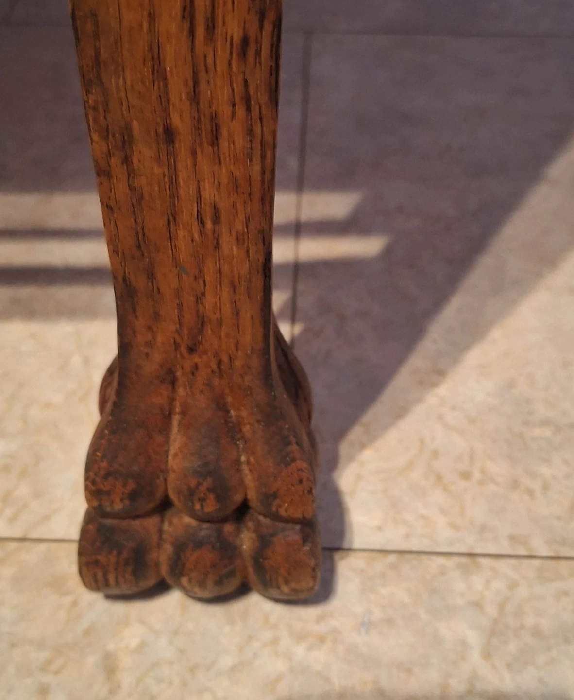 Selling an antique armchair. It has a unique design with carved wood and patterned fabric. Carved feet design like a claws or paws.