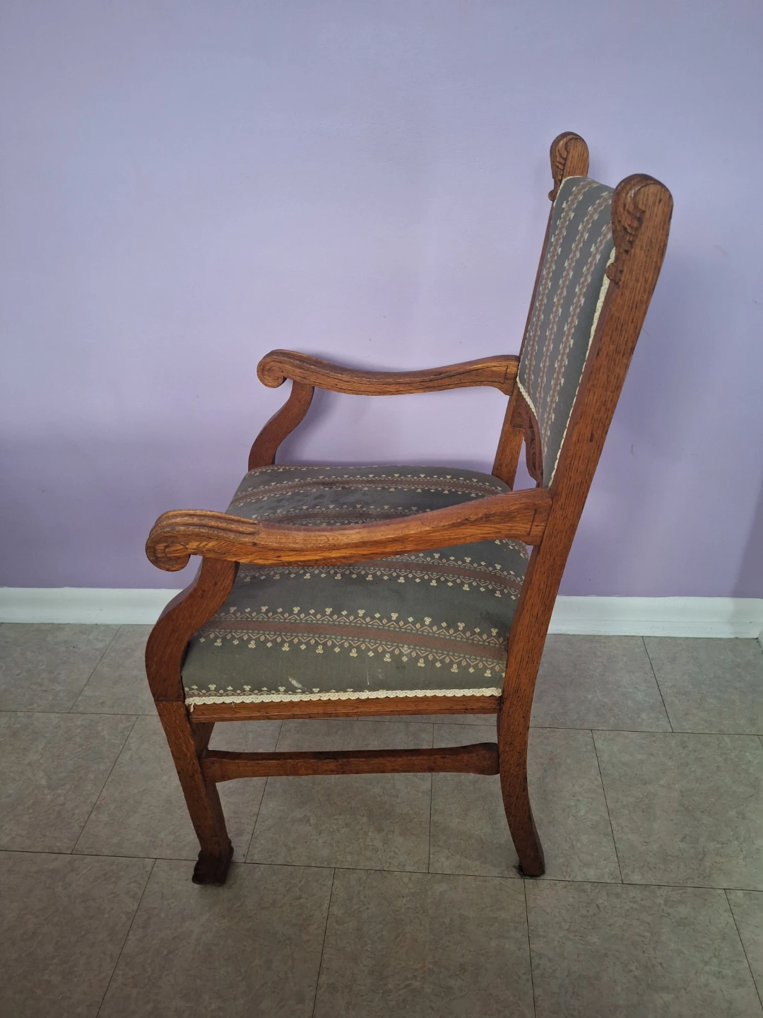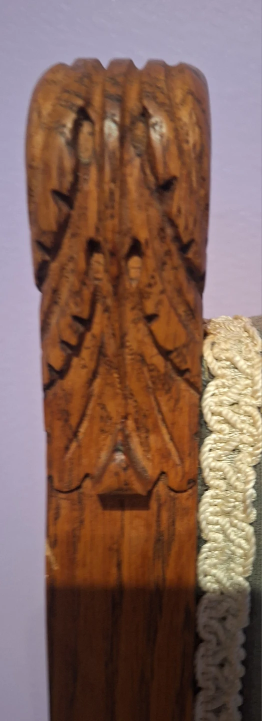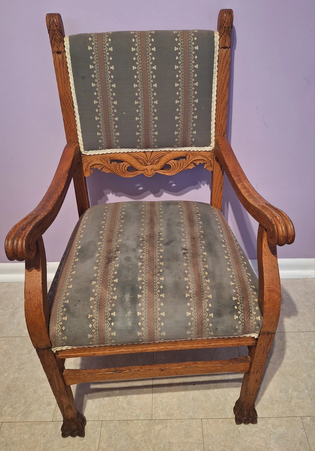Selling an antique armchair. It has a unique design with carved wood and patterned fabric. Carved feet design like a claws or paws.