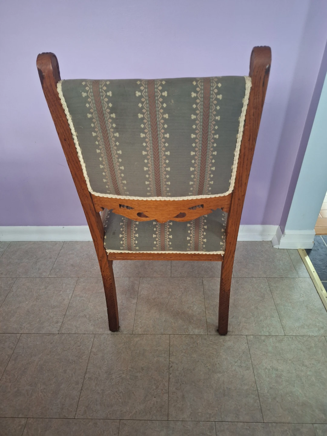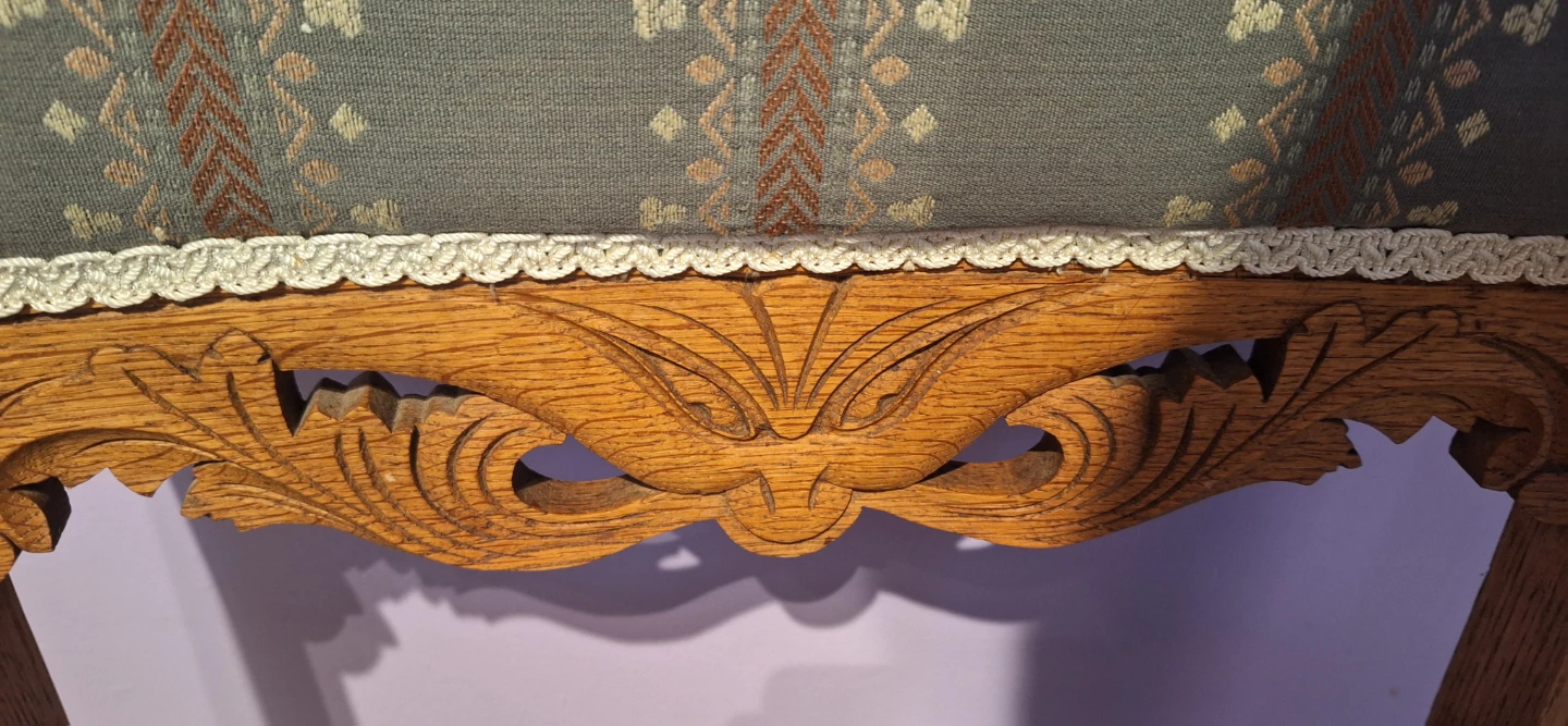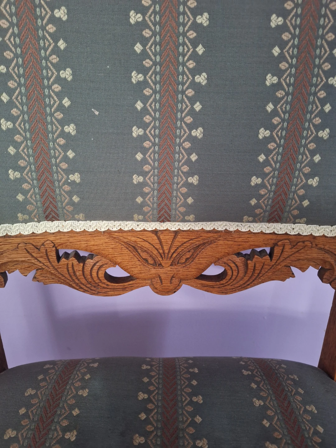 Selling an antique armchair. It has a unique design with carved wood and patterned fabric. Carved feet design like a claws or paws.