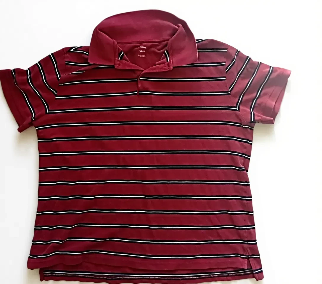 Polo shirt in size XL . It features a striped pattern in burgundy, black, and white. Great for casual wear!