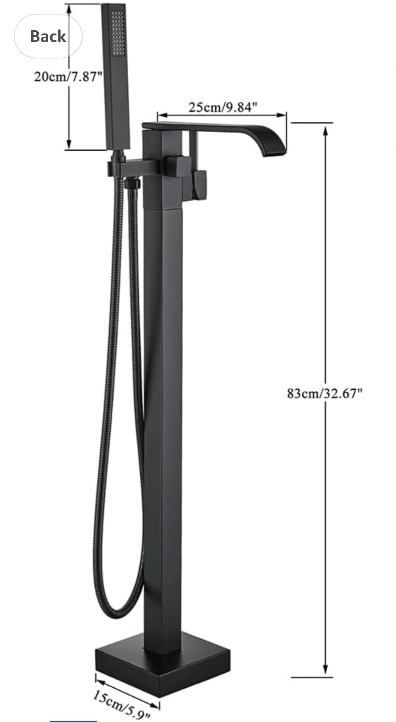 This freestanding bathtub faucet features a matte black finish and a high-flow aerated spout. It includes a handheld shower with a 59-inch stainless steel hose. The faucet body is solid brass with a sturdy ceramic valve.