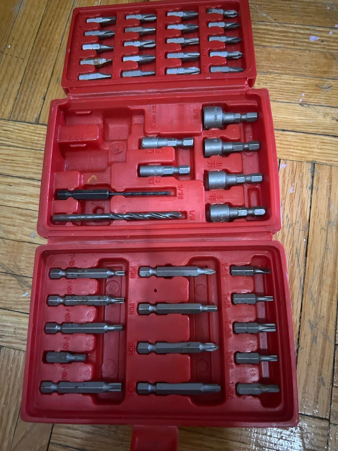 This set includes various drill and driver bits for your tools. Bits include Phillips, Torx, and flathead styles, as well as socket adapters. It's all organized in a red carrying case.