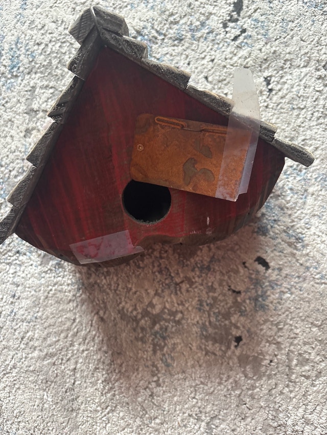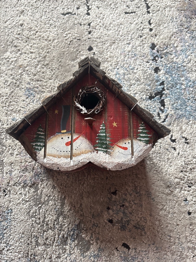 This charming, used bird house features a delightful snowman and Christmas tree design, perfect for adding a festive touch to your garden or outdoor space. It's a unique piece that's sure to attract feathered friends during the winter months. This birdhouse has some visible wear. Festive snowman and Christmas tree design. Compact size, ideal for small gardens or balconies. Durable construction to withstand outdoor elements. Cash accepted.