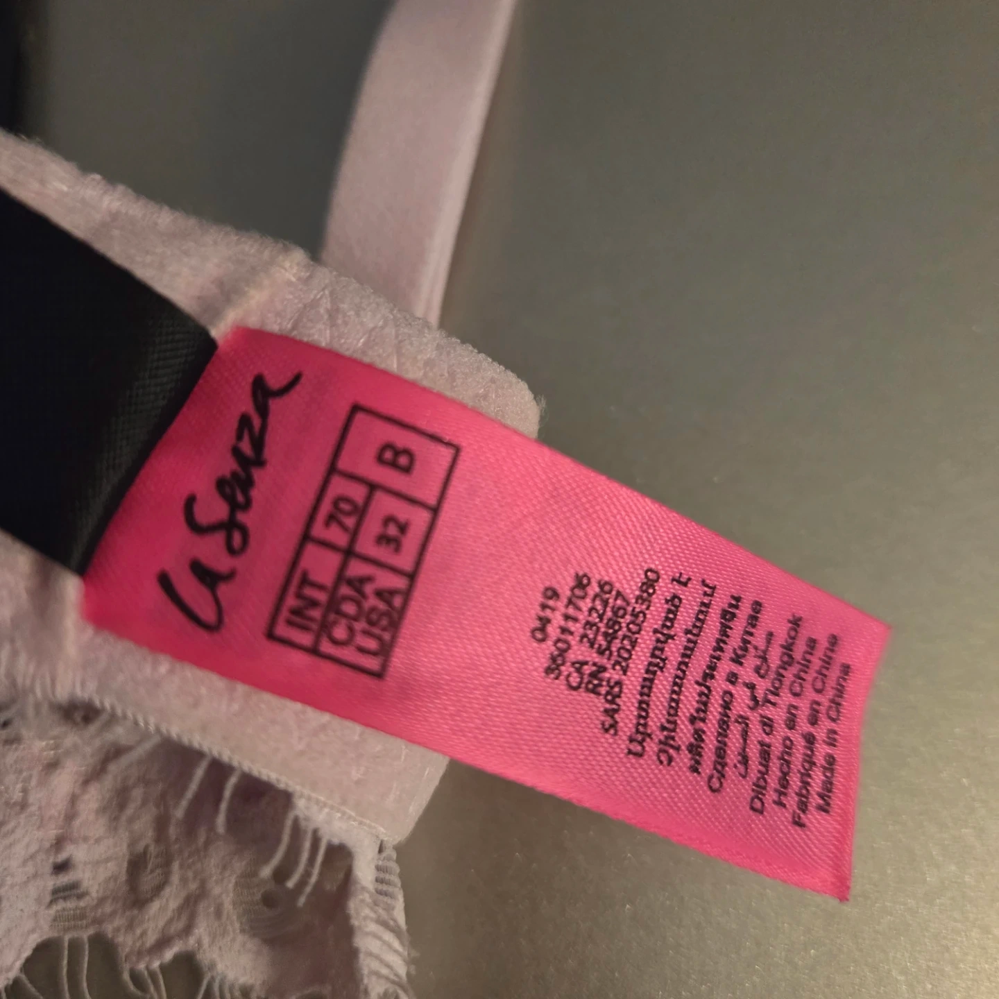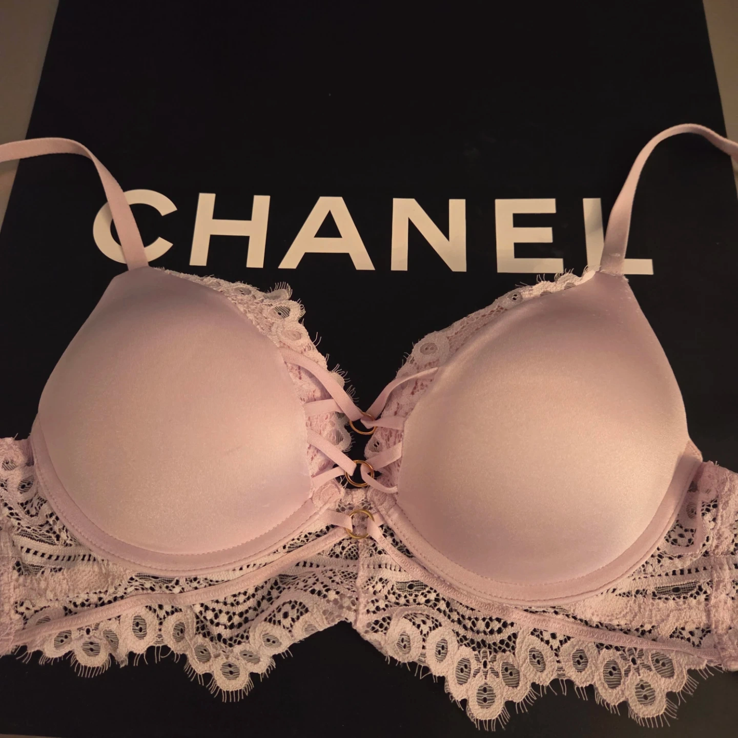A pretty pink push-up bra by La Senza. It's adorned with delicate white lace trim and features a lace-up detail at the front. Made in China.