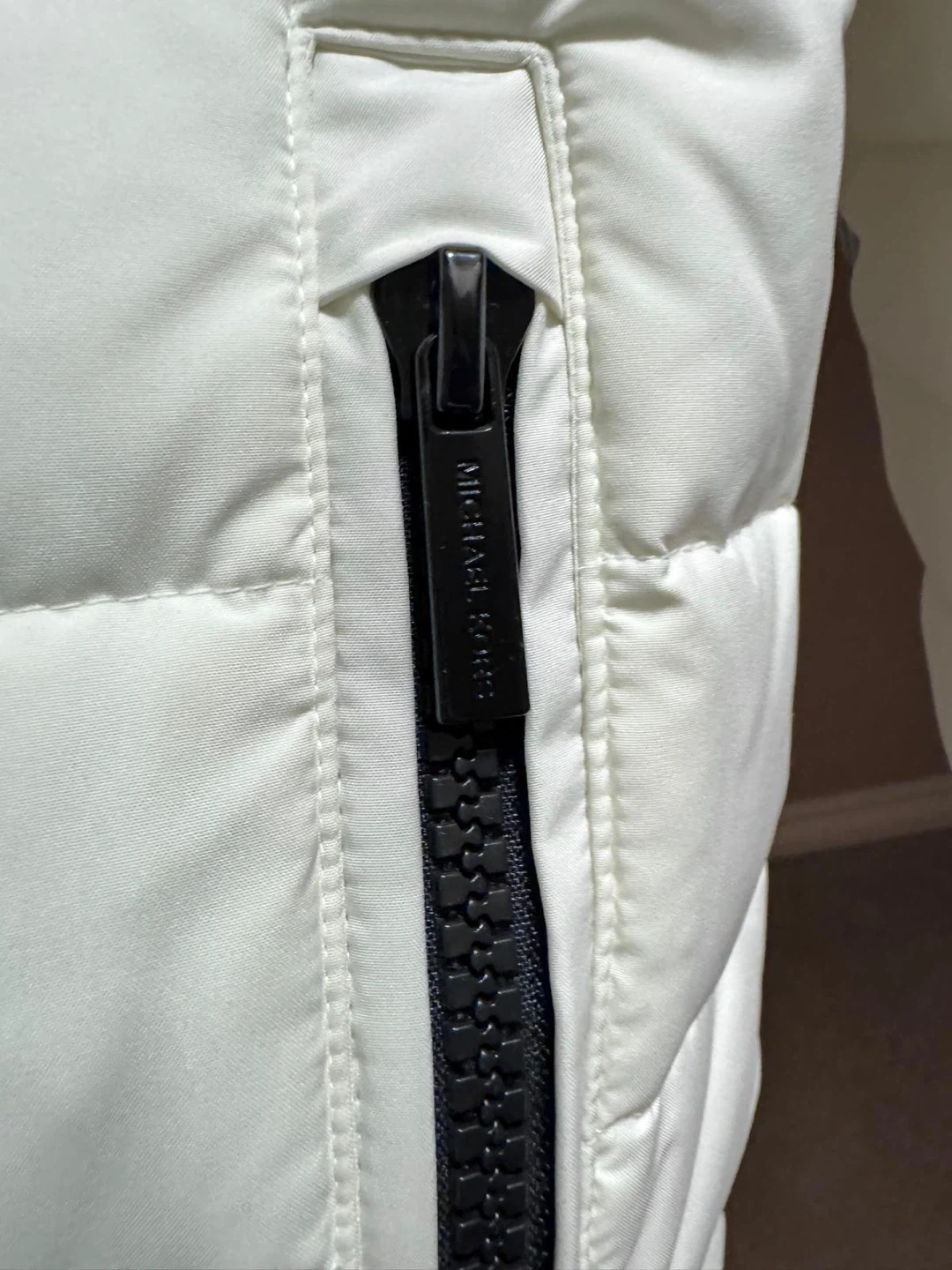 White puffer jacket by Michael Kors. Features Thermore insulation for warmth. Full zip front with zippered pockets. Hooded design.