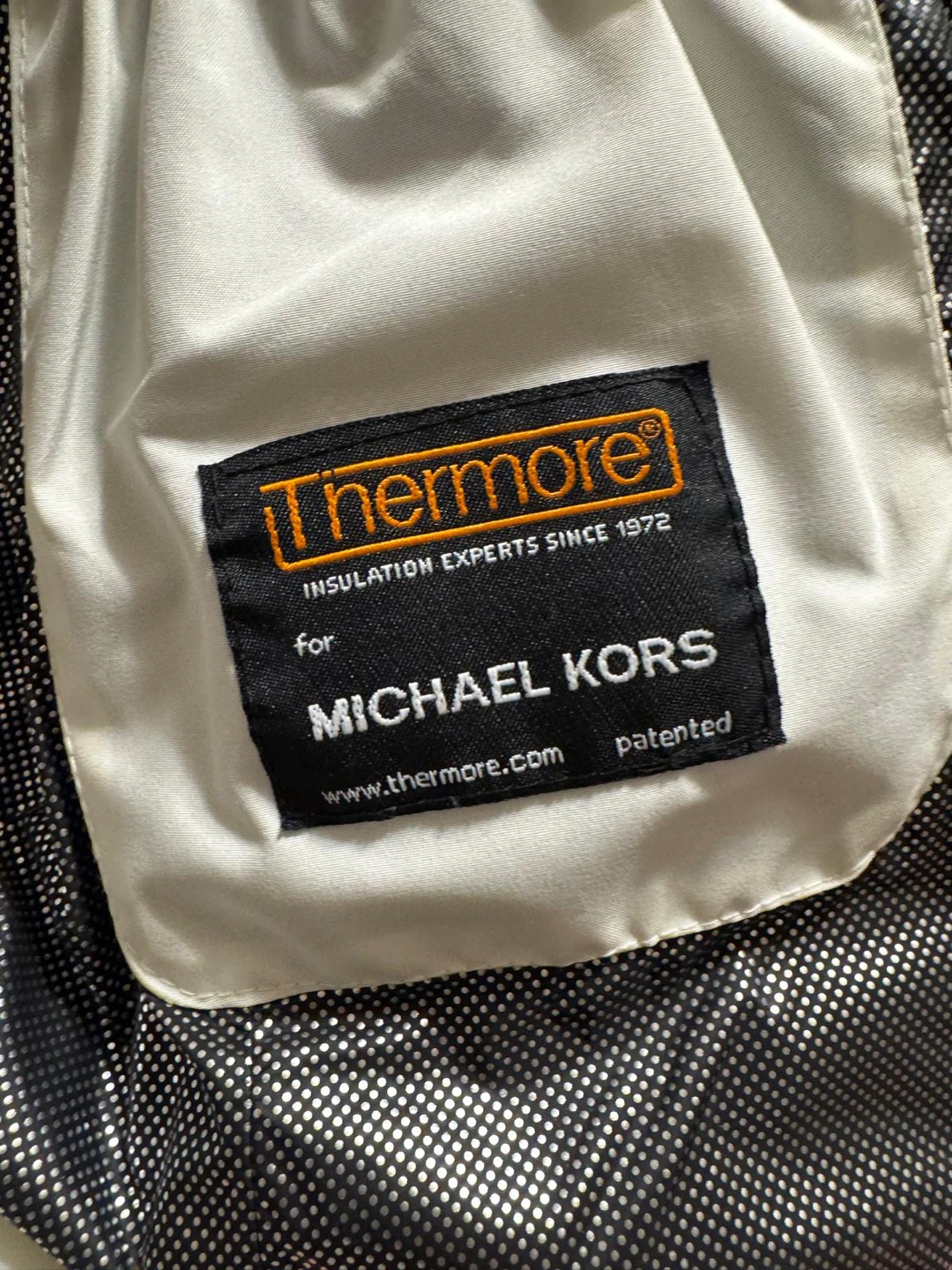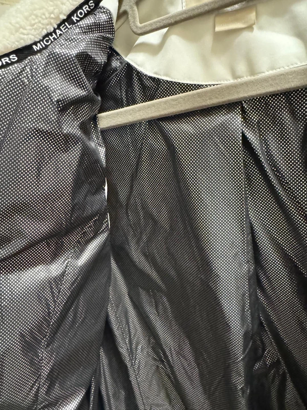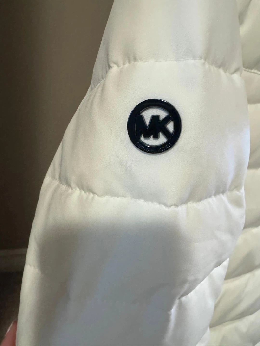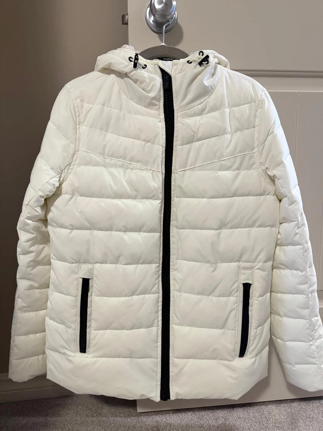 White puffer jacket by Michael Kors. Features Thermore insulation for warmth. Full zip front with zippered pockets. Hooded design.