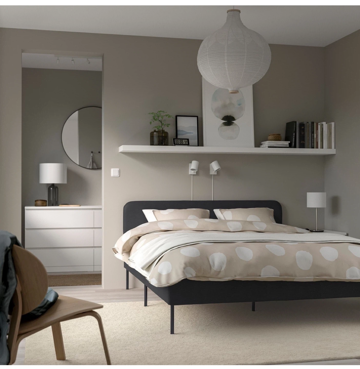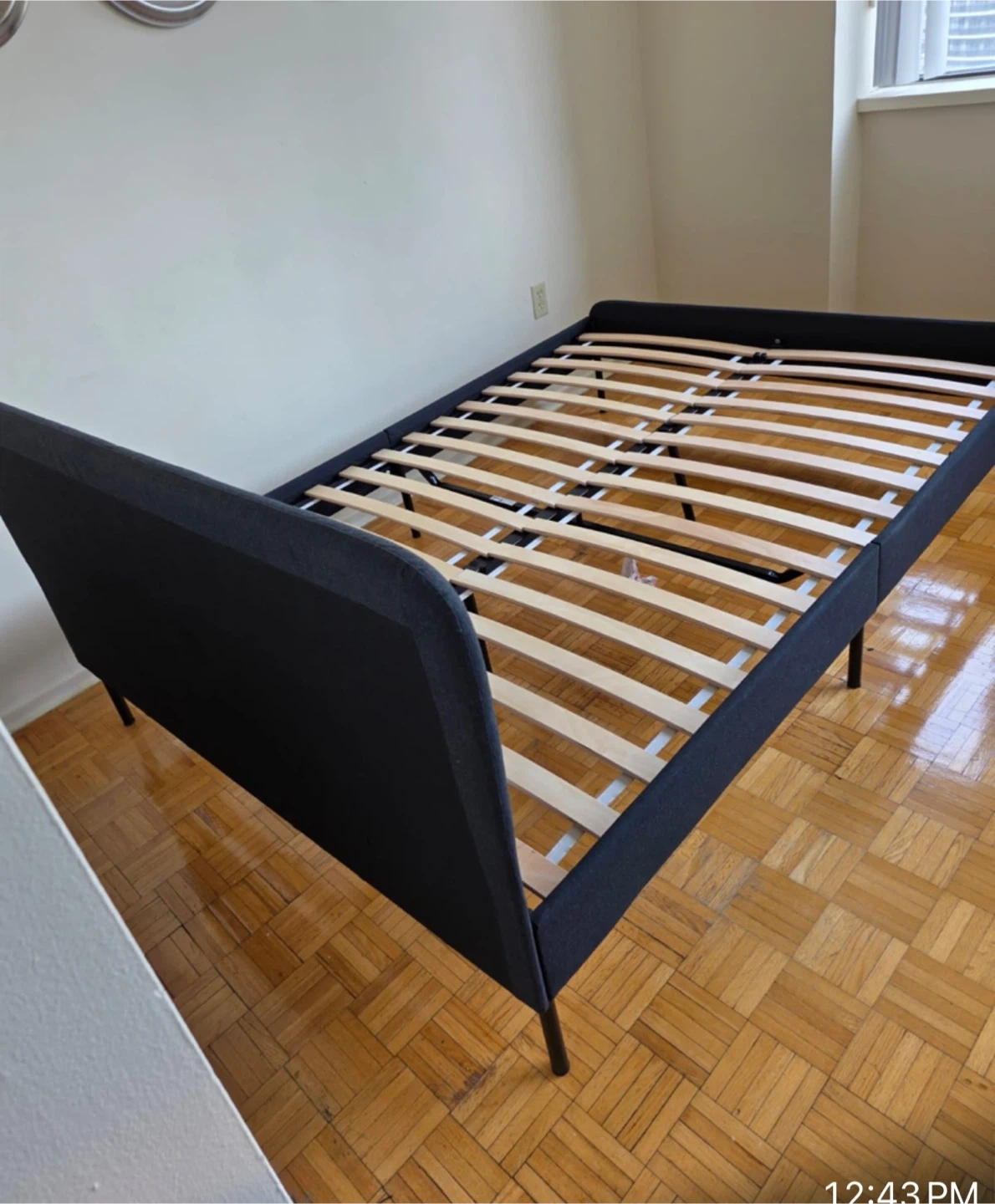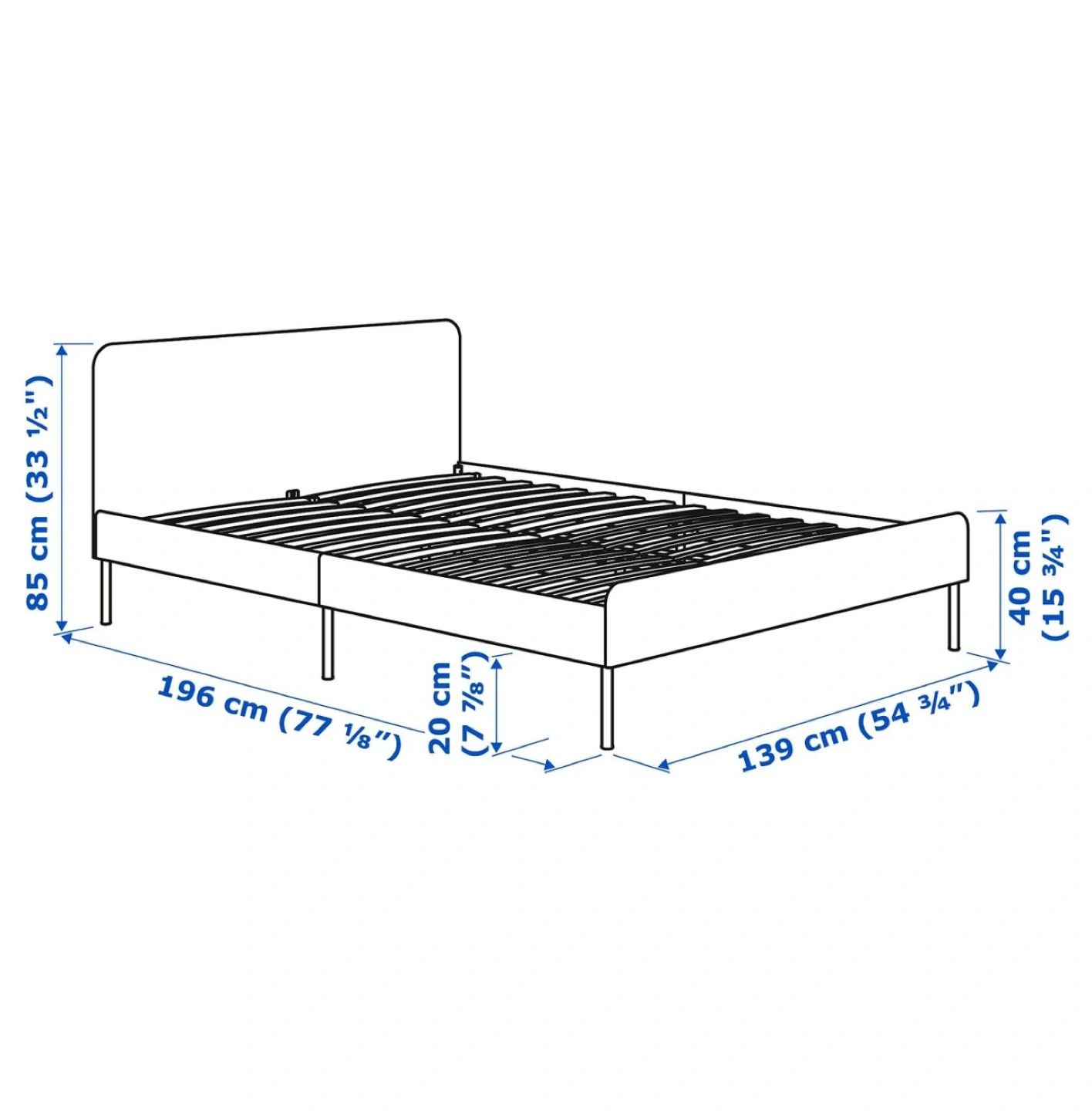 This is an IKEA NEIDEN bed frame in black. It has a slatted bed base for mattress support. The overall dimensions are 196 cm long and 139 cm wide. A full-sized mattress fits perfectly. Excellent condition! Used only four months.