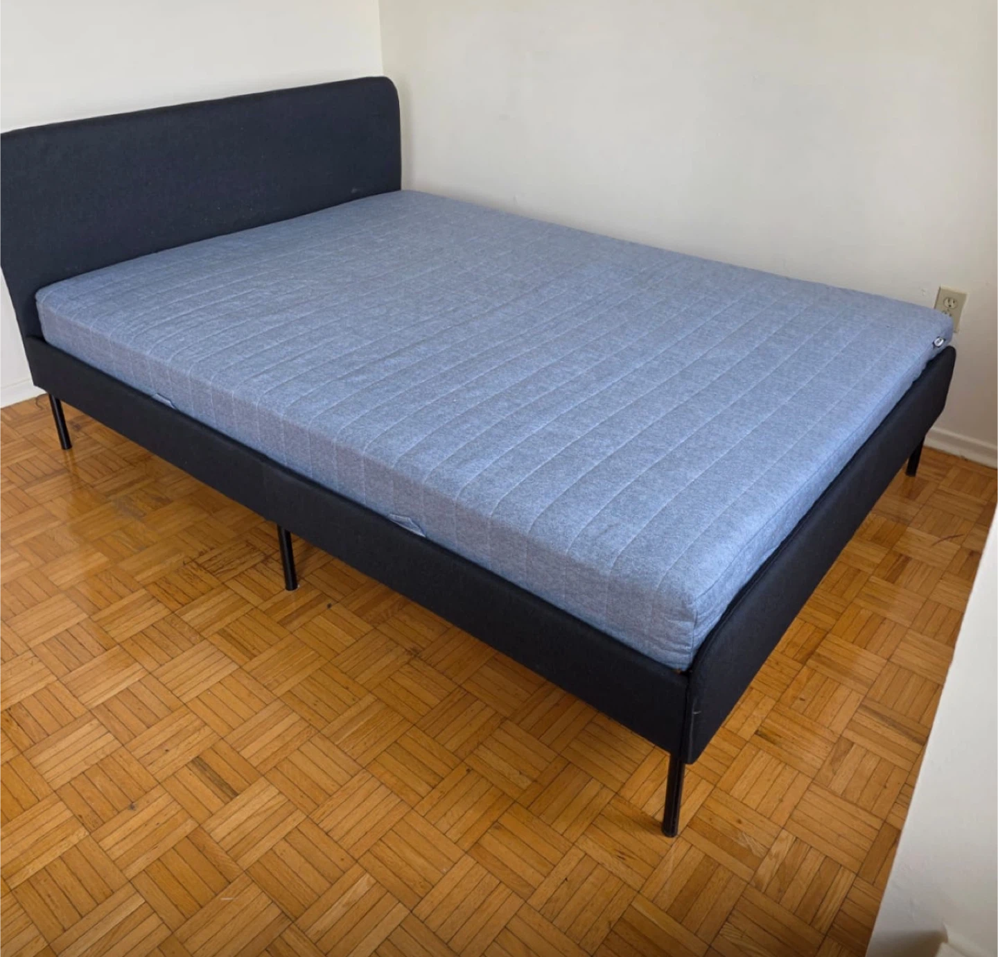 This is an IKEA NEIDEN bed frame in black. It has a slatted bed base for mattress support. The overall dimensions are 196 cm long and 139 cm wide. A full-sized mattress fits perfectly. Excellent condition! Used only four months.