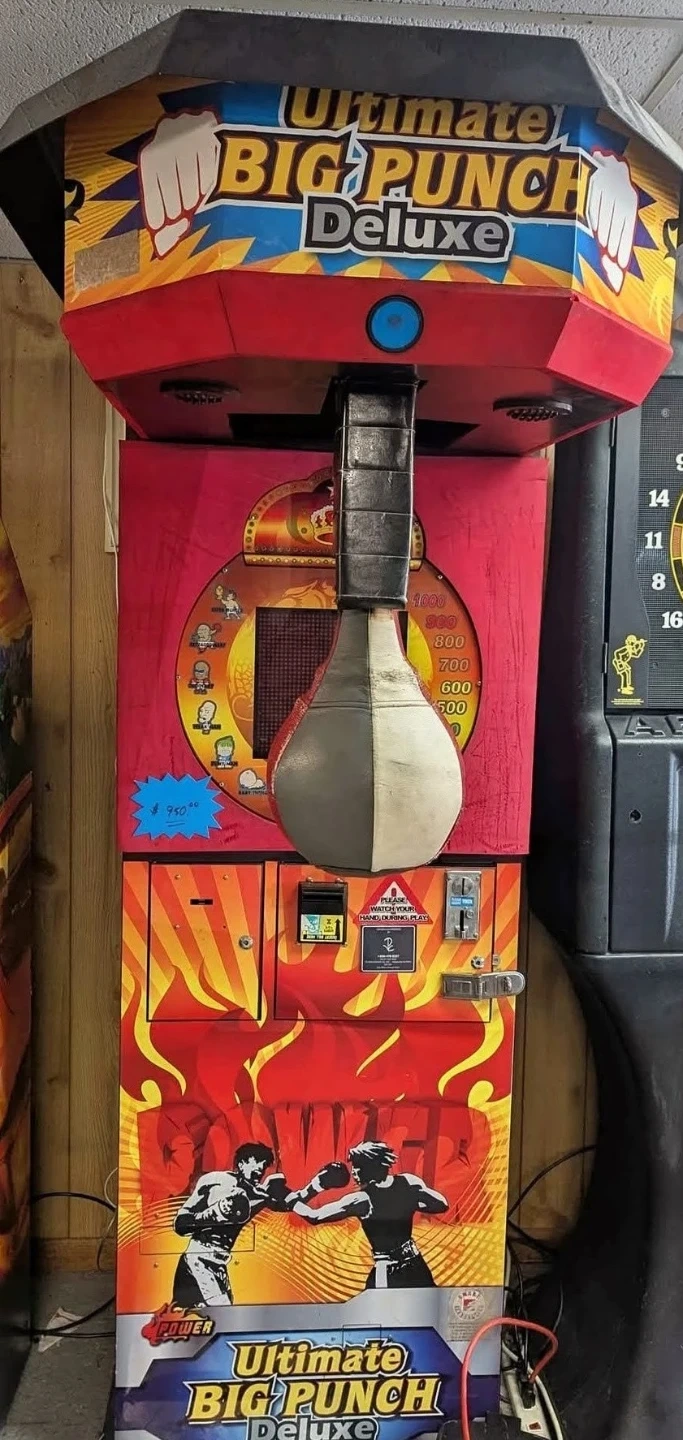 This is the Ultimate Big Punch Deluxe arcade boxing game. It's a full-size machine ready for your home or business! The display shows scoring and punch count. It's got exciting graphics and sounds to keep players engaged.