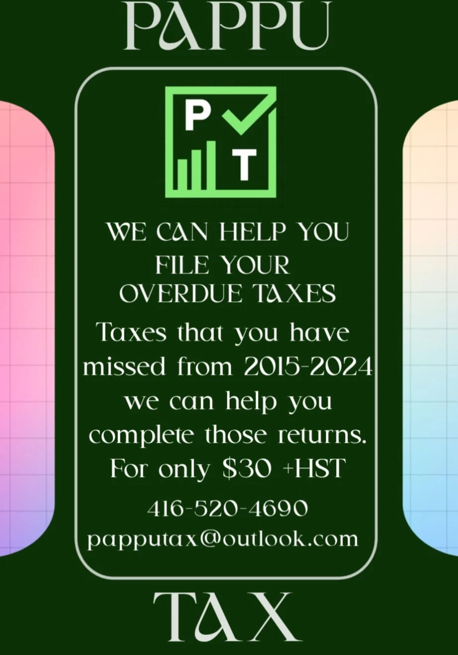 Hello Pappu Tax this is the best sale for all my new clients. We can do OVER DUE tax all your MISSED TAX. I can File 2015 to 2025 that for you as low as $30 +HST.