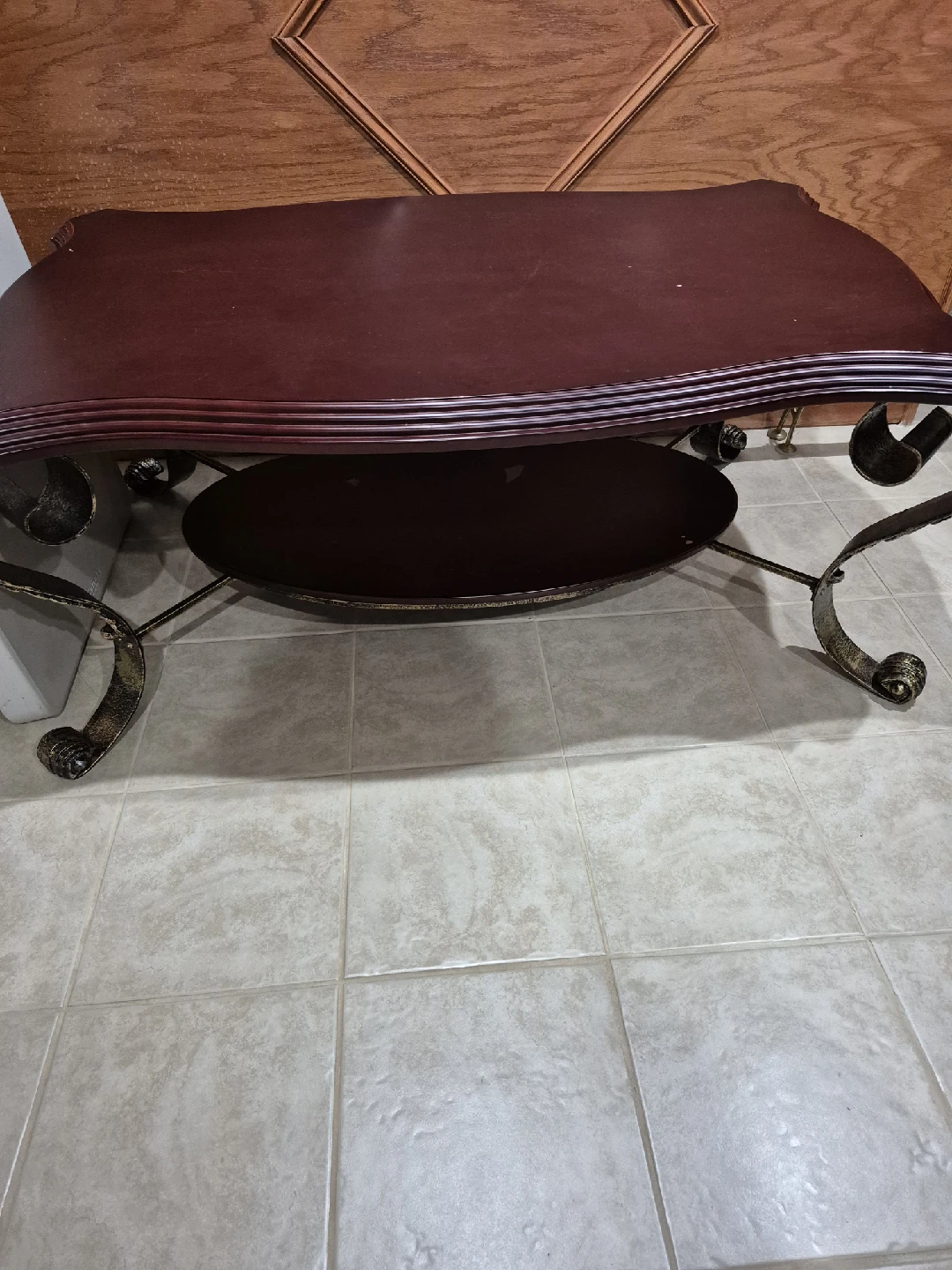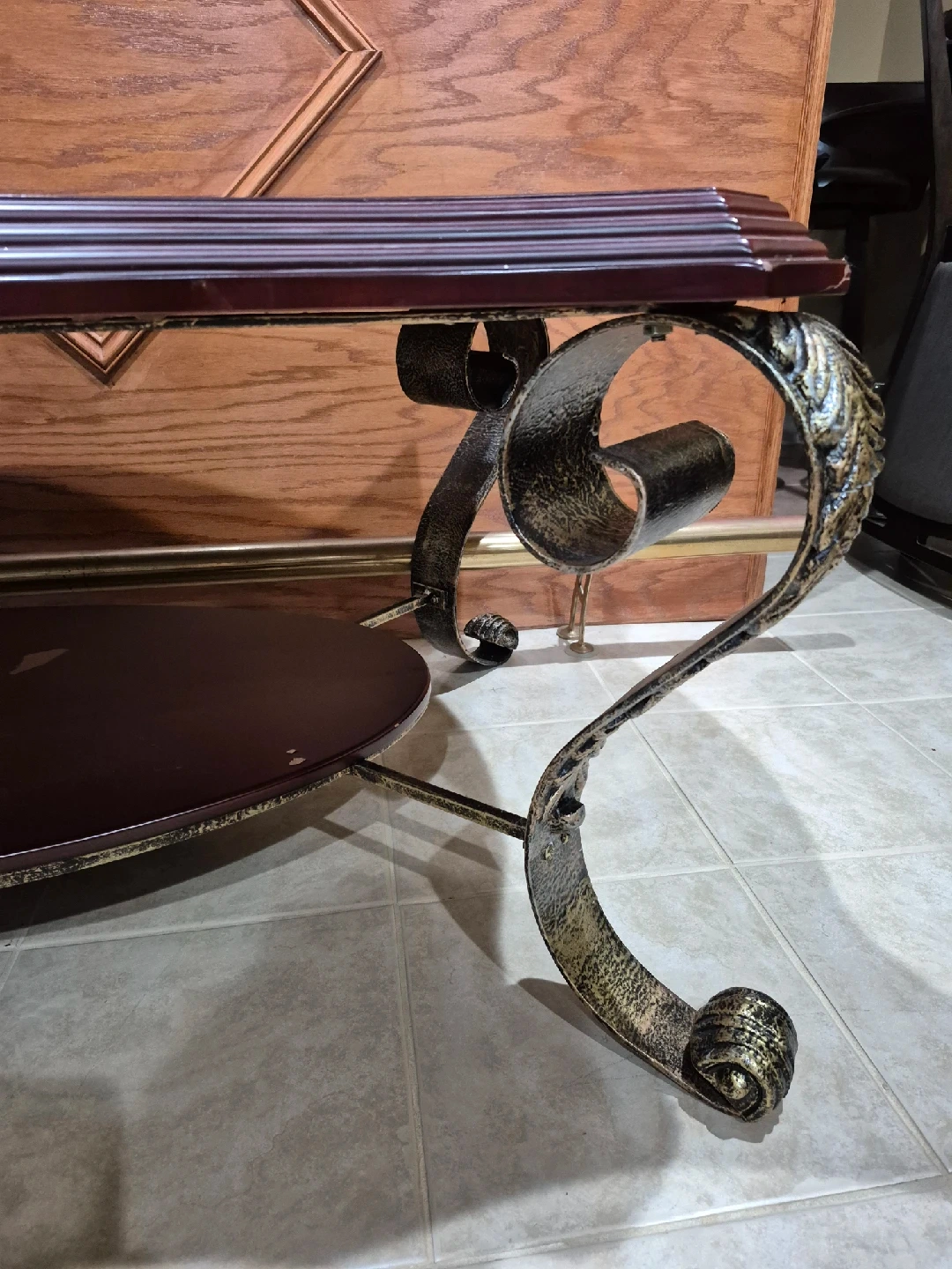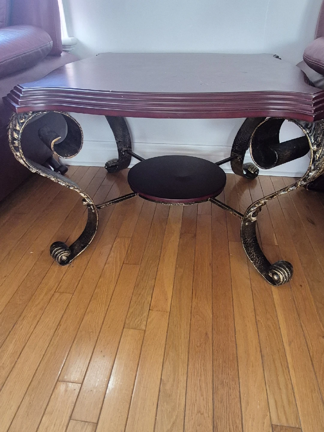 Selling a vintage coffee table with a dark wood top and ornate metal legs. It has a unique design and a lower shelf for storage. The table shows some signs of wear, but it's still a sturdy and stylish piece for any living room