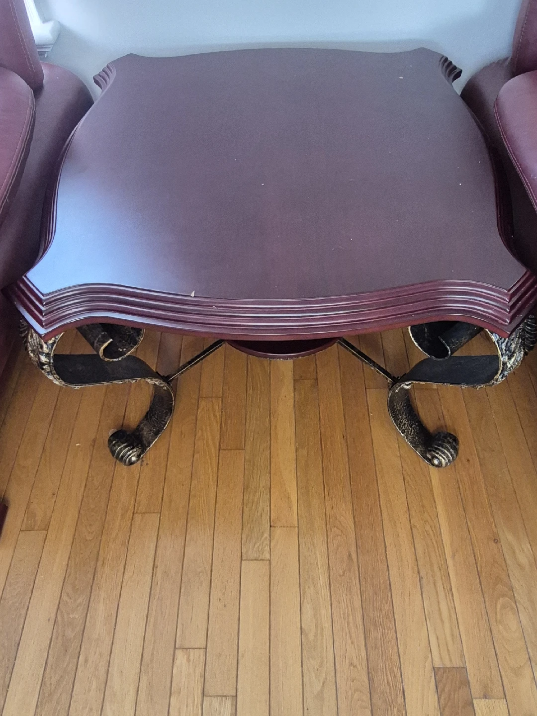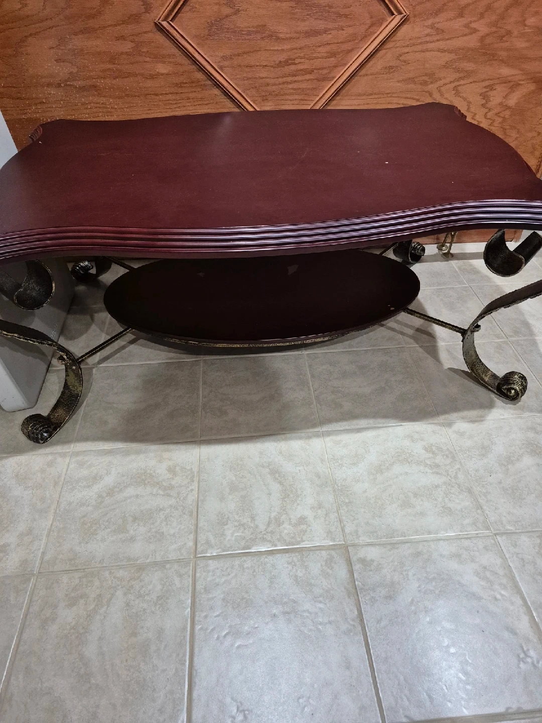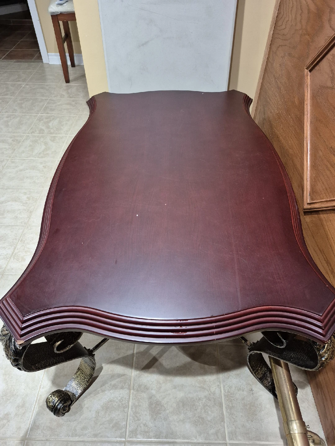Selling a vintage coffee table with a dark wood top and ornate metal legs. It has a unique design and a lower shelf for storage. The table shows some signs of wear, but it's still a sturdy and stylish piece for any living room