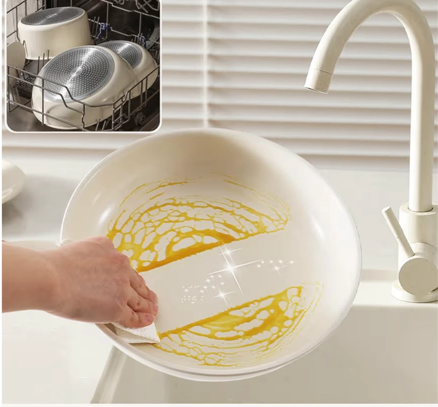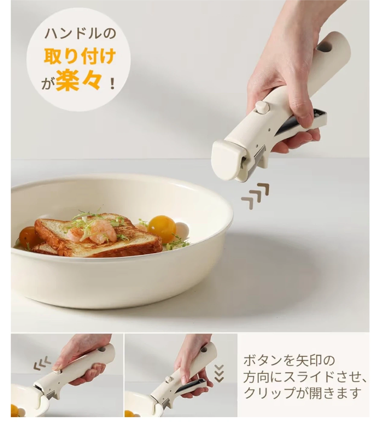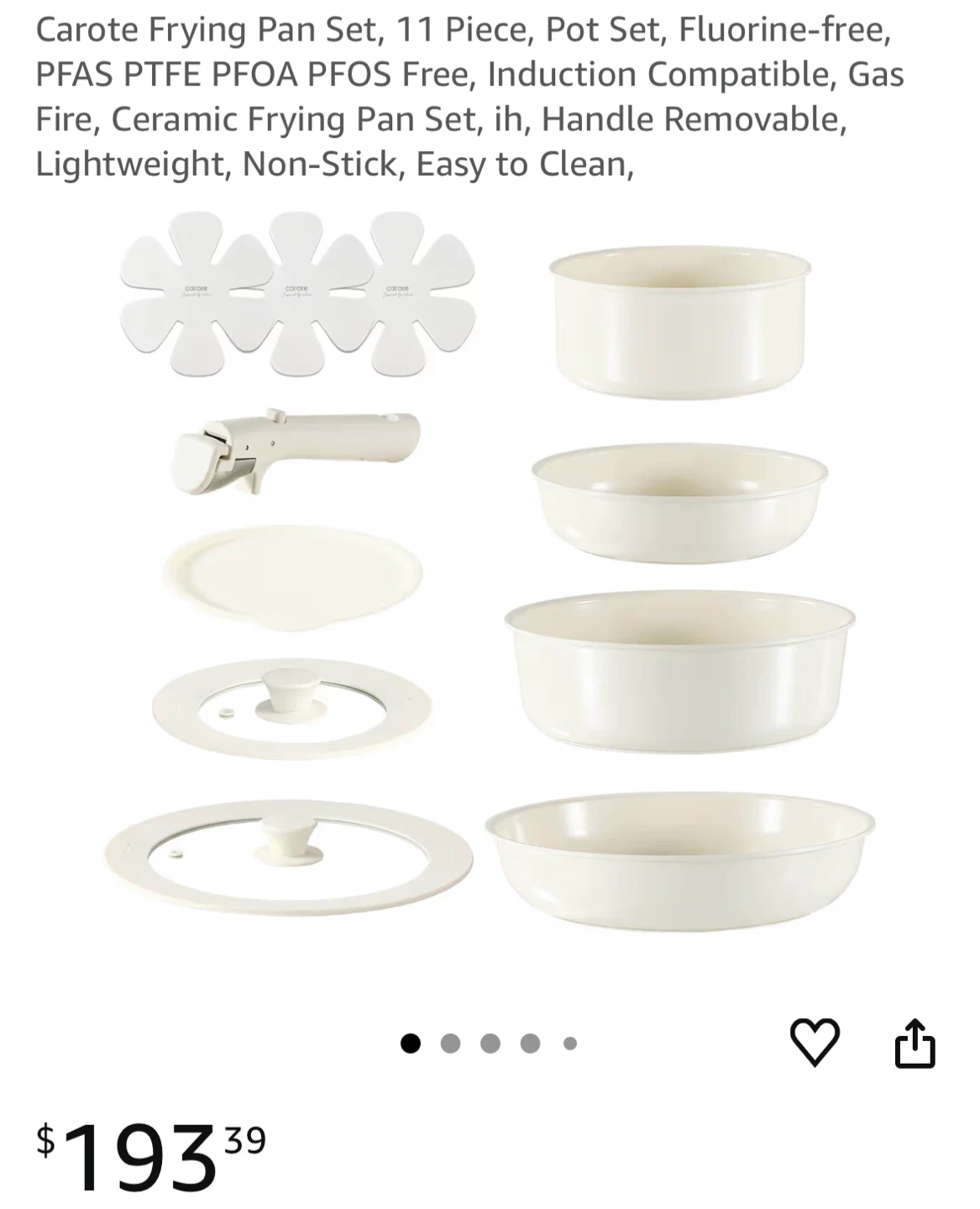 Selling a Carote Detachable 11-Piece Cookware Set in cream white! This set is fluorine-free and compatible with induction and gas stoves. It's also non-stick and easy to clean. The detachable handle makes storage a breeze! Comes with the original box and original packaging