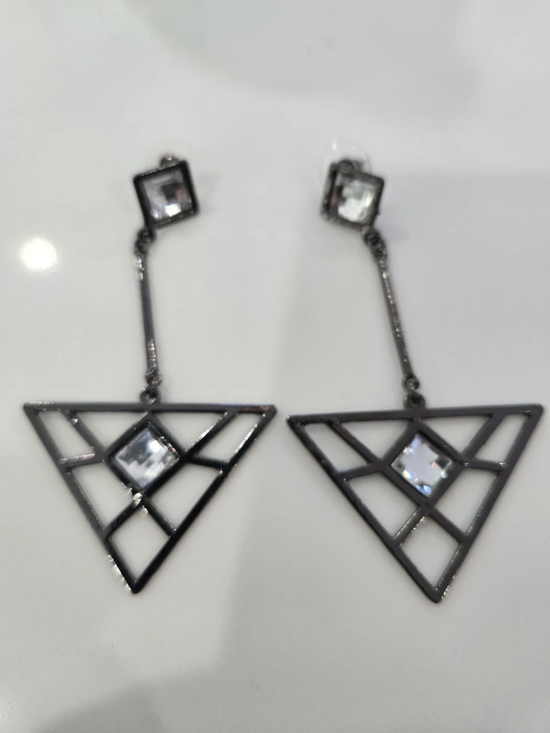 Selling a pair of geometric dangle earrings. They are sipver and have a triangle shape with a square stud. Great for dressing up any outfit!