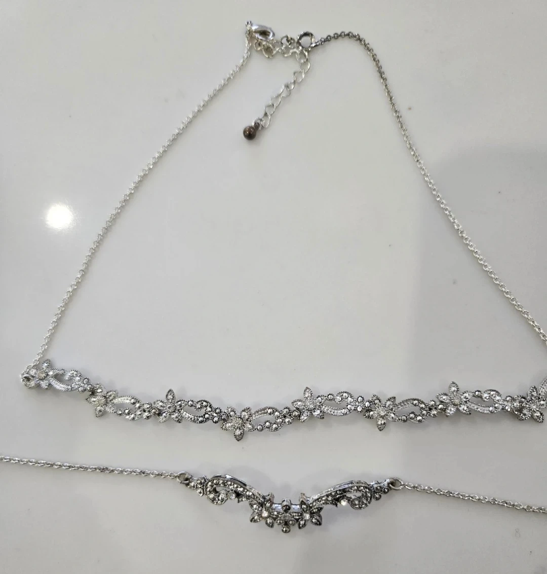 Selling a lovely necklace and bracelet set in silver colour. The set has a delicate floral design with sparkly accents, perfect for adding a touch of elegance to any outfit