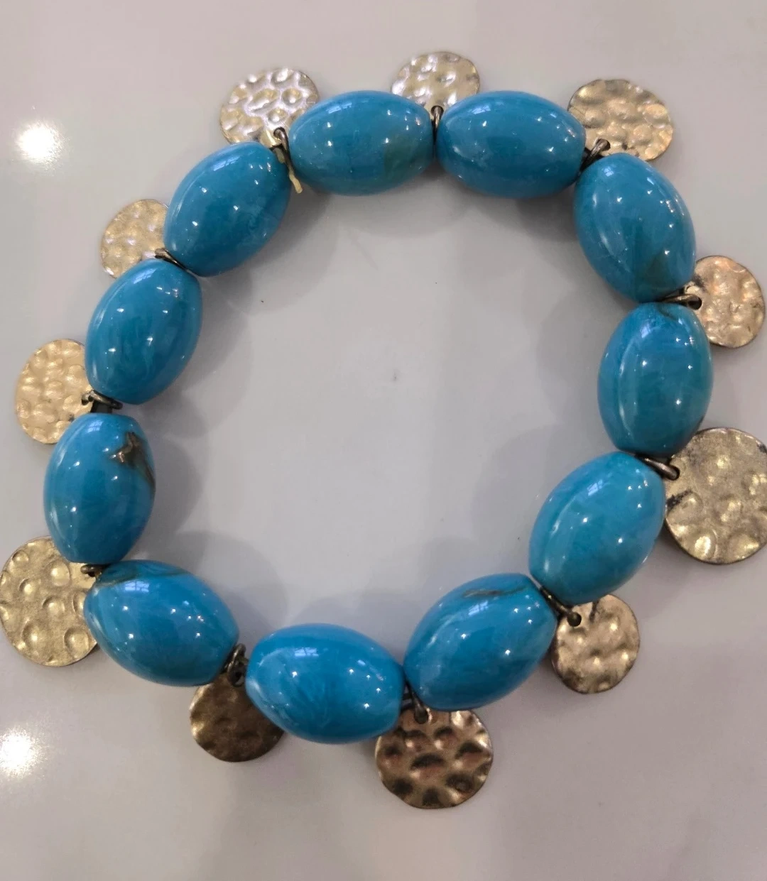 This bracelet features beautiful turquoise-coloured beads complemented by gold-tone hammered discs. It's a stylish accessory that adds a pop of colour to any outfit. Perfect for casual or dressy occasions!