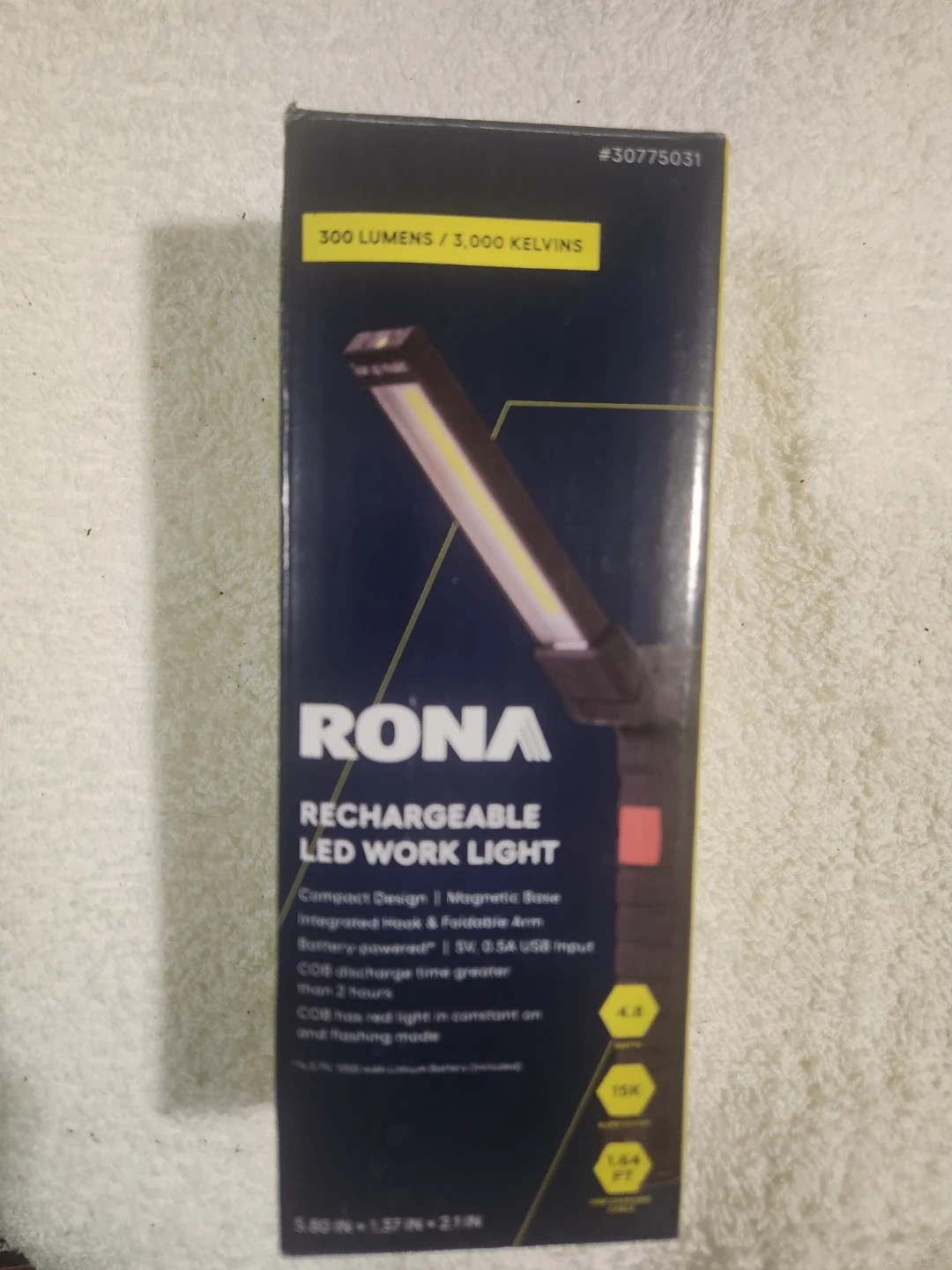 Selling a brand new RONA Rechargeable LED Work Light! This work light features a compact design with a magnetic base and an integrated hook and foldable arm. It's battery-powered and has a 5V, 0.5A USB input. The COB discharge time is greater than 2 hours, and the COB has a red light in constant and flashing mode. It emits 300 lumens at 3,000 Kelvins. Dimensions are 5.80 in x 1.37 in x 2.1 in