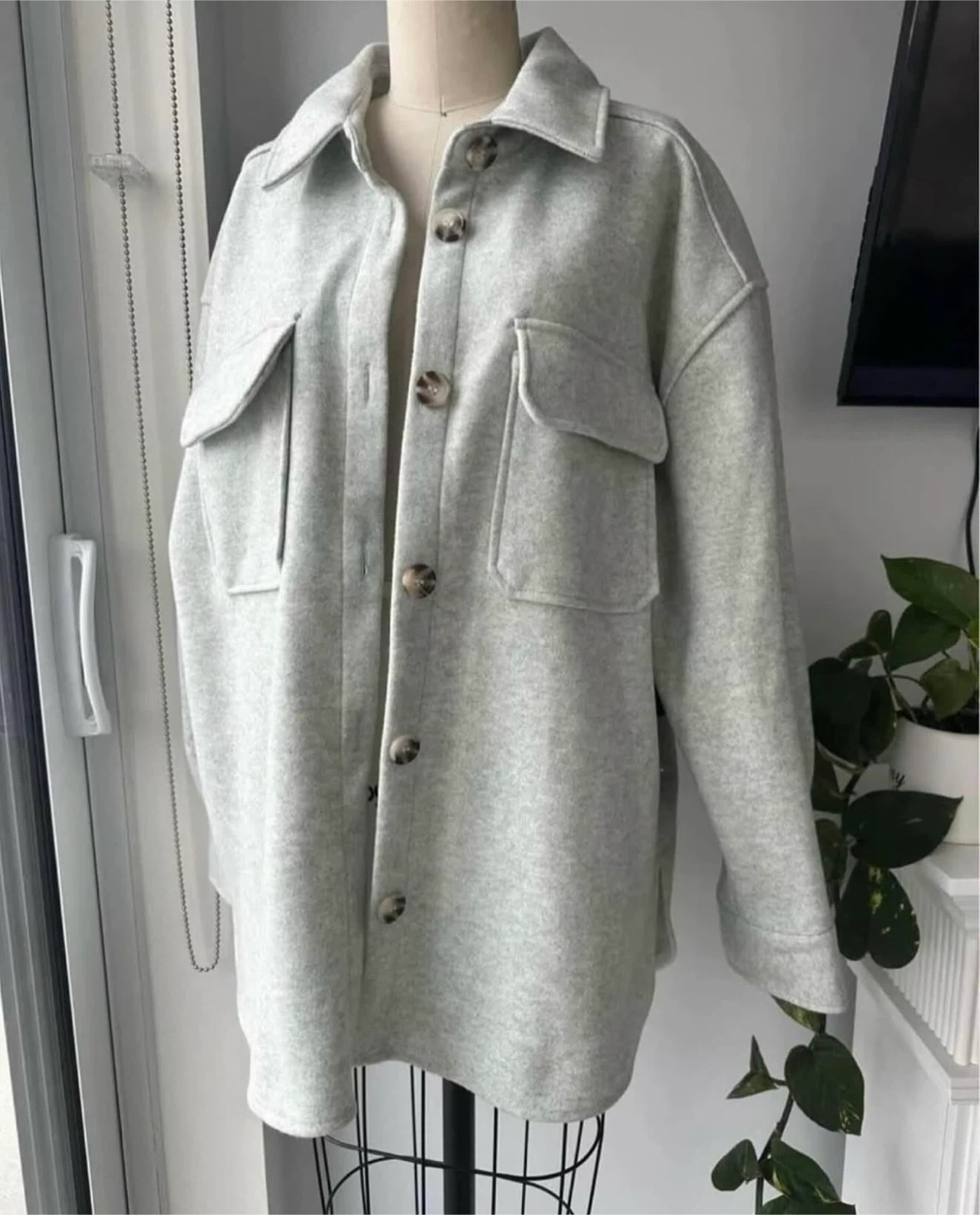 1000+Selling a lovely grey shacket! It features a collared neckline, button-down closure, and two handy pockets on the chest. Perfect for layering!
