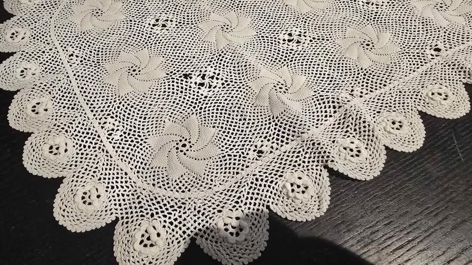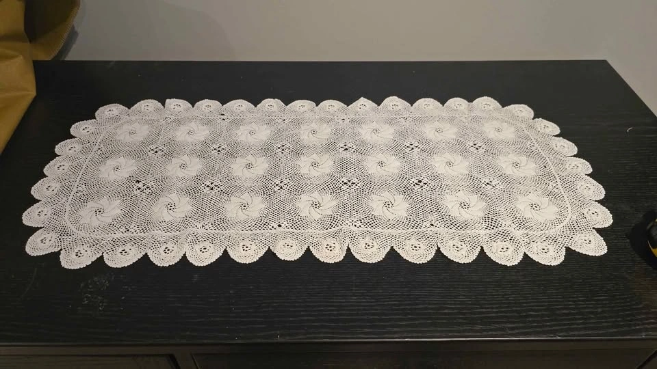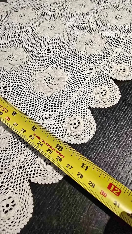 60This is a white lace table runner from my mom's collection, imported from Italy. It's made of cotton featuring embroidered floral patterns. These runners are used as decorative items for dining tables, coffee tables, and other furniture. Mom used these during the holidays, but she also had many on furniture as everyday. There is another one listed as well, which is Ivory.