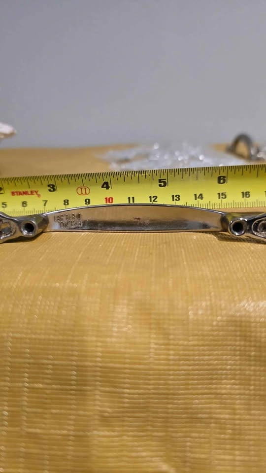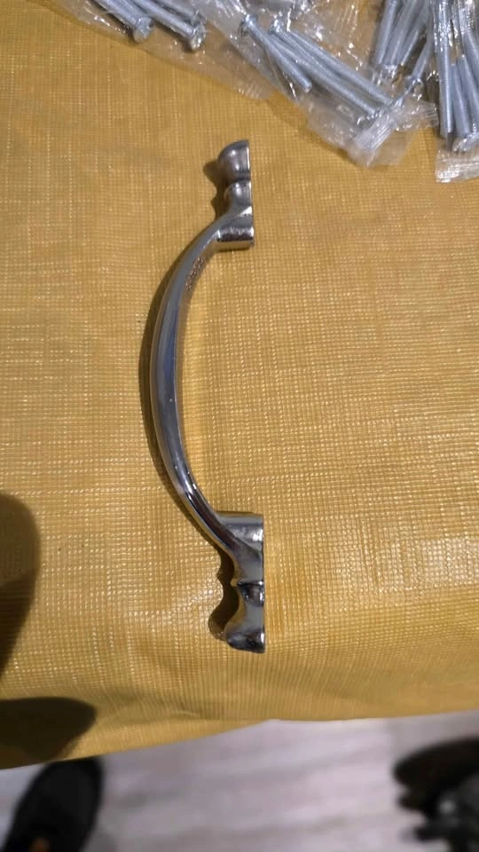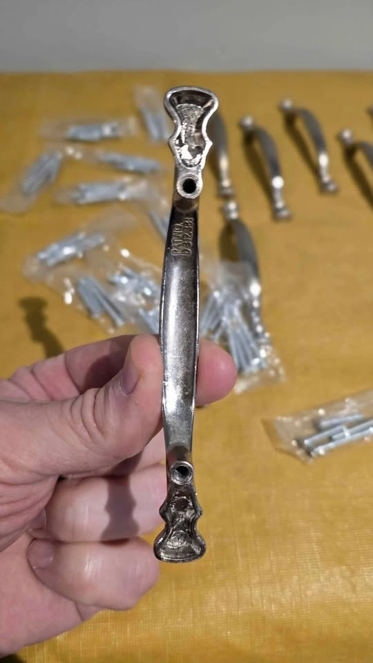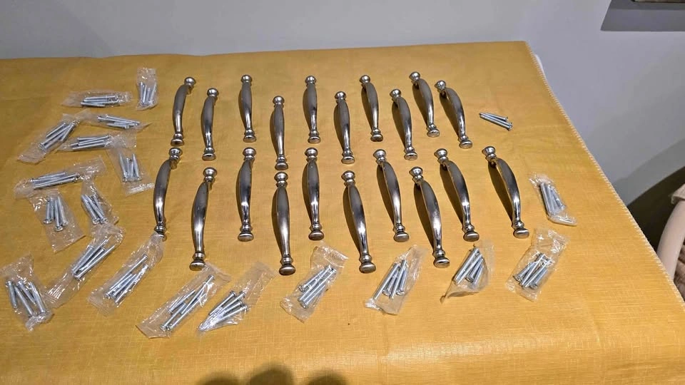 20 cabinet pull handles and their corresponding screws. Screws are new. 3 inches on center, as shown. The handles are a traditional or classic style with a metallic finish. Needs a little soaking, wipe and clean, and install.